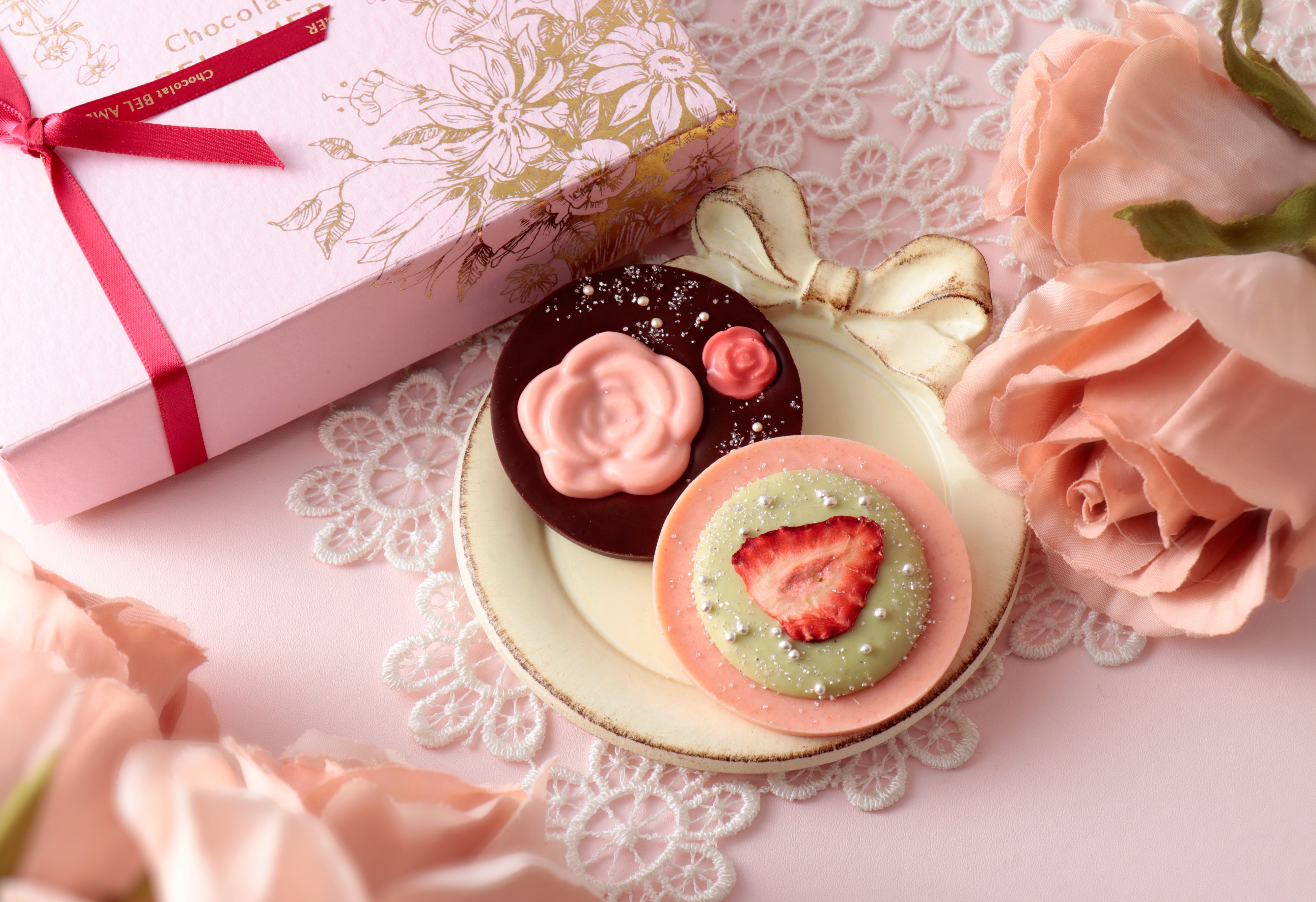 ローズの香りやはちみつの風味の「ローズノワール」、自家製のドライ苺やピスタチオのムースなどをあしらった「ピスタチオフレーズ」など春らしく優しい味わいの2種のパレショコラを期間限定でお届けします。