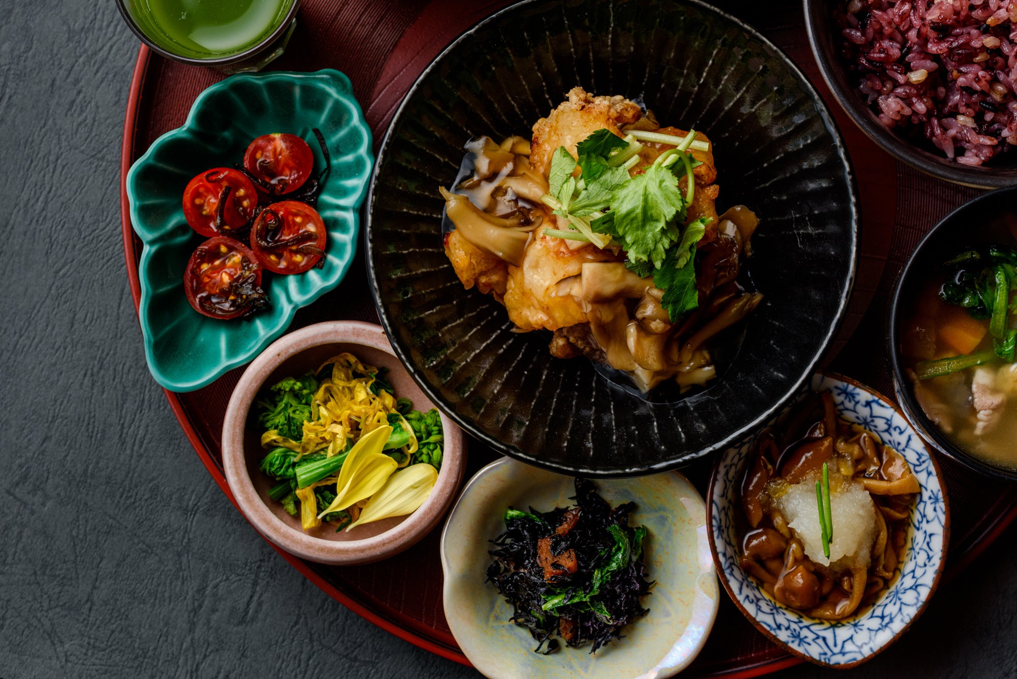 定食は、新鮮な野菜をそのままジュースにしたグリーンジュースに、主菜、副菜、十六穀米、豚汁をご用意しました。家庭的ながら手の込んだ“旬のおかず”を丸いおぼんいっぱいに並べて、「こんなものが食べたかった」の想いにお応えします。