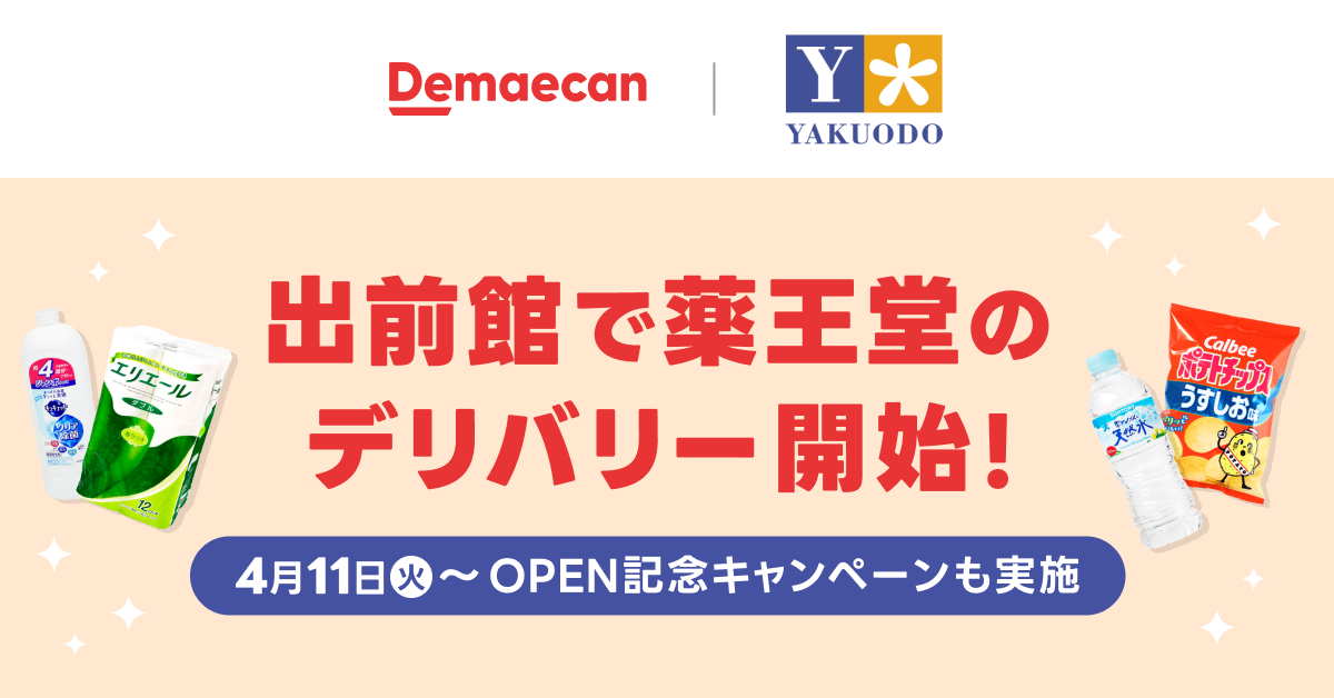 株式会社出前館(本社:東京都渋谷区、代表取締役社長:藤井英雄)が運営する日本最大級のデリバリーサービス『出前館』と、株式会社薬王堂(本社:岩手県盛岡市、代表取締役:西郷辰弘)が運営する「薬王堂」は、『出前館』でデリバリーを宮城県内3店舗にて開始いたします。また、今回の出店を記念し、2023年4月11日(火)~18日(火)まで「薬王堂」OPEN記念キャンペーンを実施いたします。