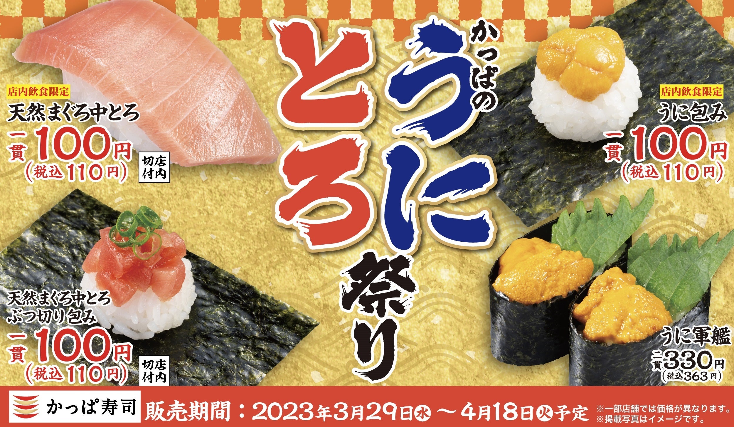 | 3月29日(水)より高級・人気ネタ満喫フェア&季節ならではの推しネタをご提供中 『かっぱのうにとろ祭り』&『かっぱの春の推しネタ』 |