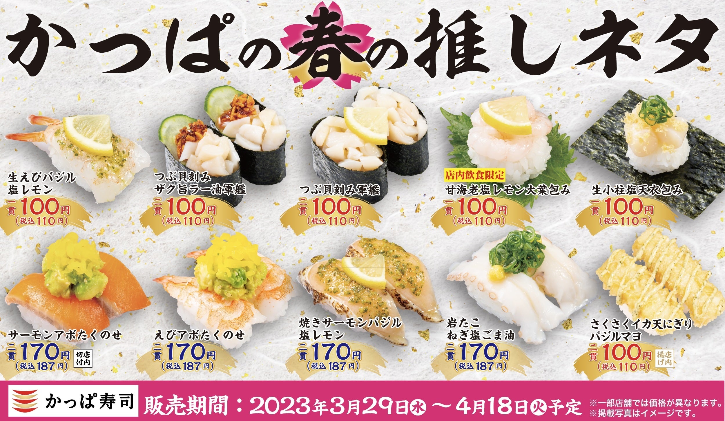 『かっぱの春の推しネタ』では、『生小柱塩天衣包み』や『甘海老塩レモン大葉包み』など、各一貫110円(税込)でご提供しております。その他にも、例年ご好評いただいている爽やかな風味のバジルシリーズも販売しております。ぜひ、『生えびバジル塩レモン』や『焼きサーモンバジル塩レモン』など、アレンジメニューもご堪能ください。