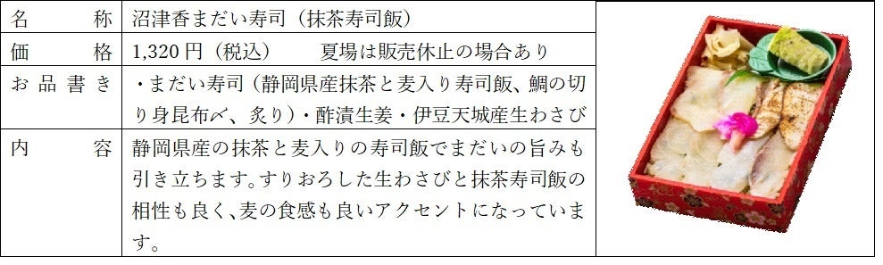 【抹茶あじ寿司】【沼津香まだい寿司(抹茶寿司飯)】【抹茶めし弁当】の3種類で、それぞれ静岡県産の抹茶を寿司飯やご飯に使用し、通常の駅弁とまた違う爽やかな風味が特徴です。