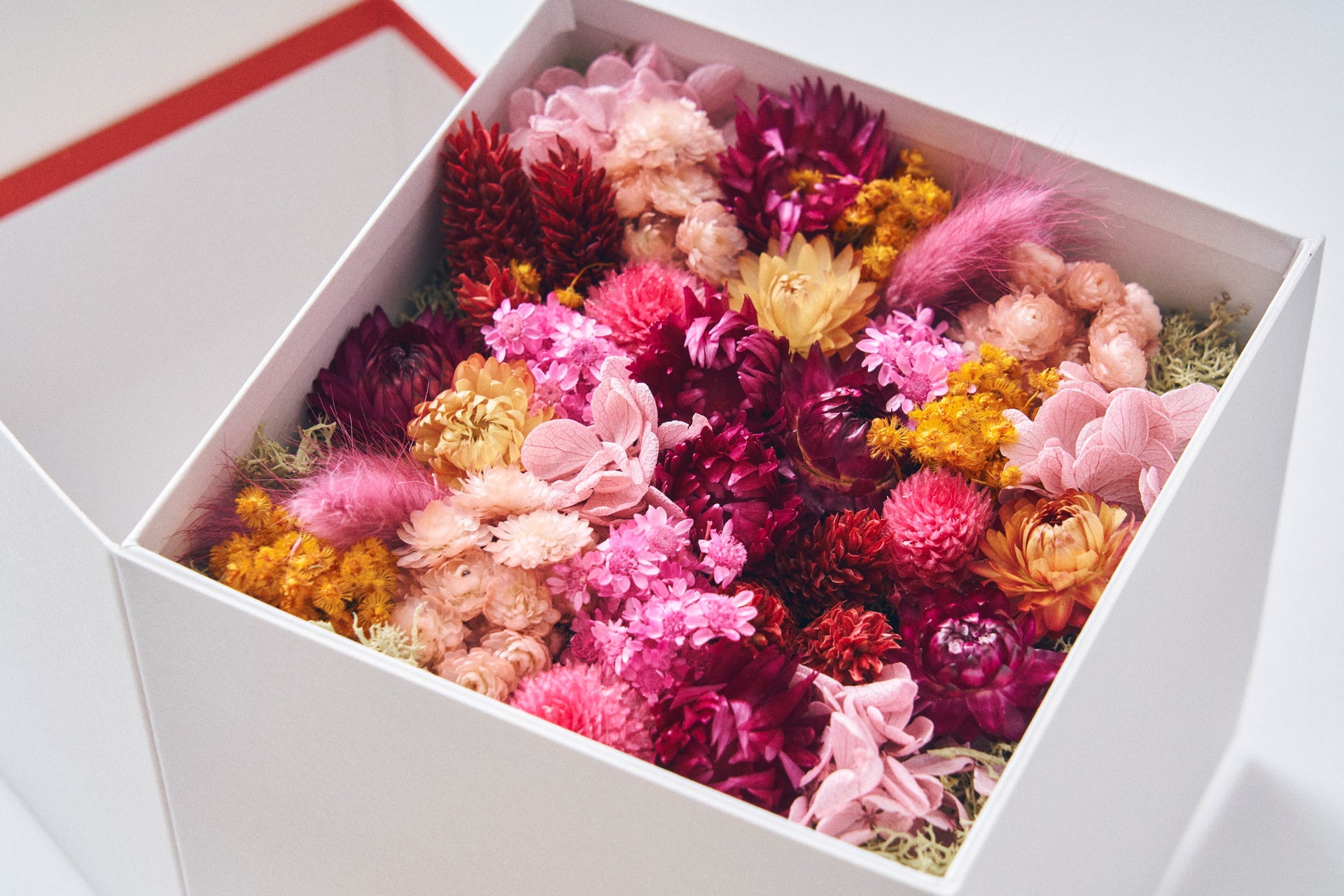 パッと目を引く色とりどりのドライフラワーやプリザーブドフラワーを使用した優美で心弾むボックスアレンジメントに、お花のイメージに合わせて作り上げた多彩な焼き菓子を組み合わせ。スイーツとお花が一緒に楽しめるうれしいギフトです。食べ終わったあとも“飾れる小物入れ”として長くご利用頂けます。ふたを開けた瞬間、思わず「わぁ〜」と歓声があがる、嬉しいサプライズに。お母さんの笑顔を咲かす、母の日らしいスイーツギフトです。