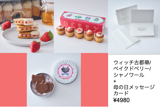 フェアリーケーキフェアの人気アイテム「フェアリークリームウィッチ 生バターサンド」「プチカドー」「ベイクドカップケーキ」も母の日メッセージカード付きで販売いたします。大好きなお母さんと一緒においしいスイーツを囲んで、話しがはずむたのしいお茶の時間をどうぞ!