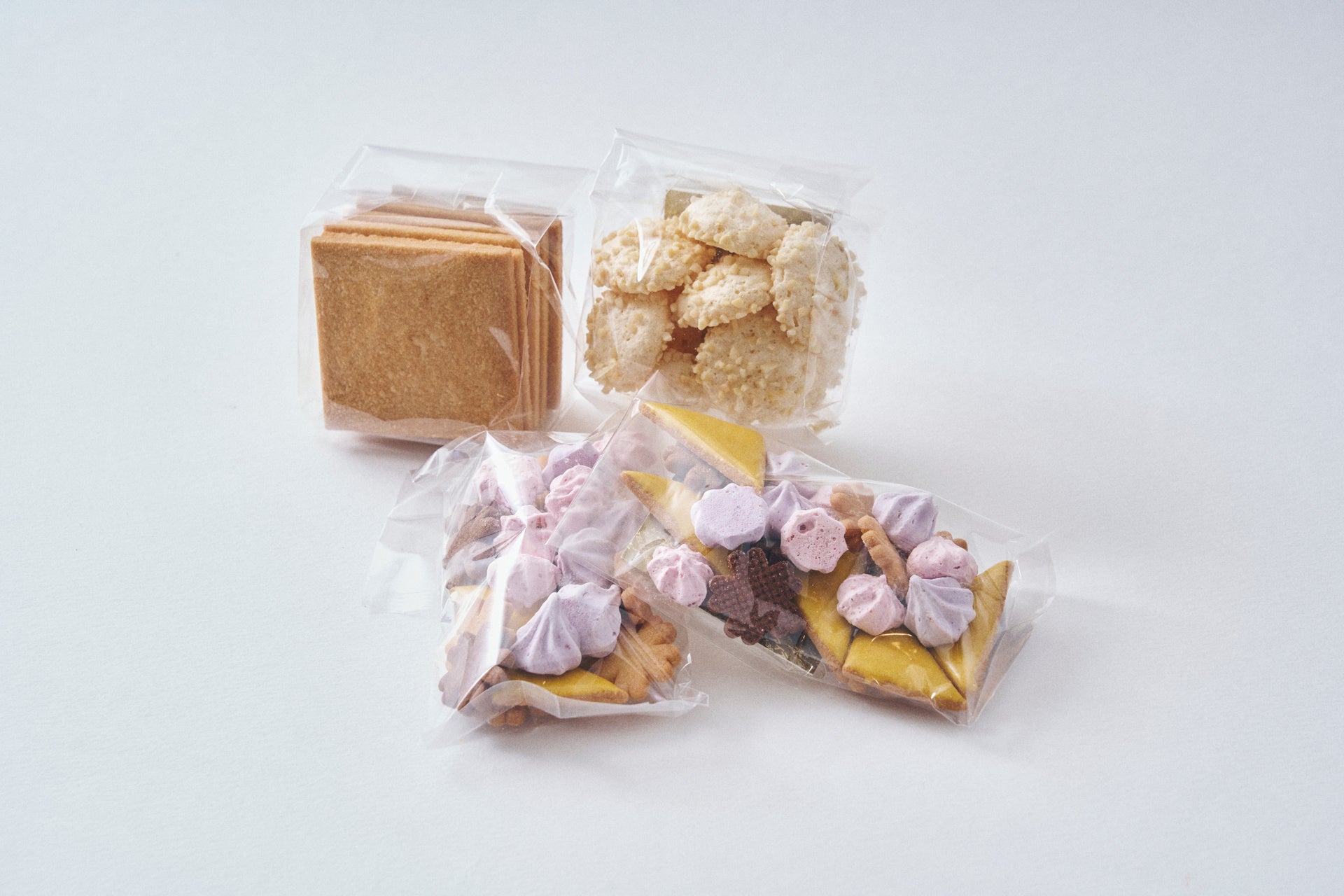 お花形のプレーンクッキーやカカオクッキー、レモンアイシングクッキーに、カシスオレンジ味やいちごラズベリー味のメレンゲを組み合わせた、色とりどりの焼き菓子を詰め合わせ。