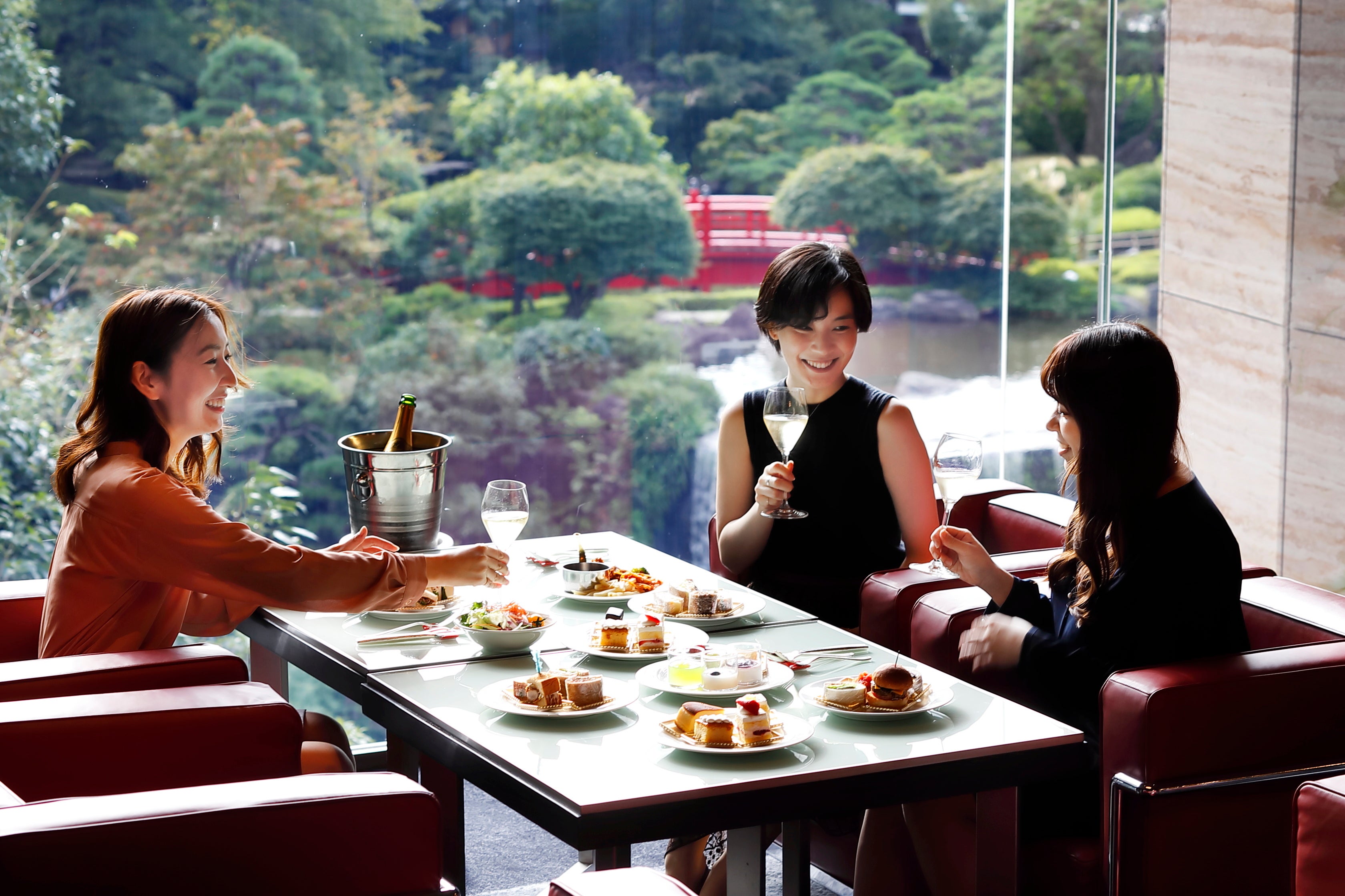 ビュッフェの舞台となるのは、加藤清正公の下屋敷や井伊家の庭園として400年余りの歴史を有し、江戸城外堀に囲まれた約1万坪の広大な日本庭園を一望できる「ガーデンラウンジ」。フルハイトウインドウから望む美しい景色を眺めながら、旬のマンゴーとメロンを使用したスイーツをご堪能ください。