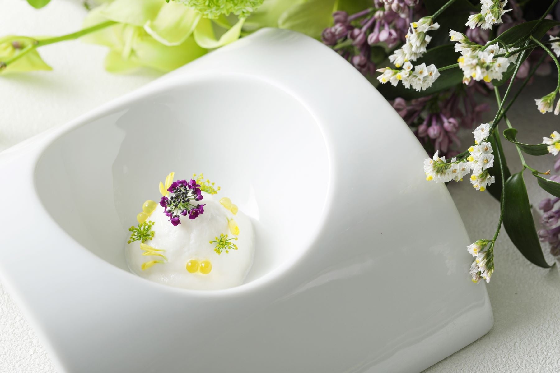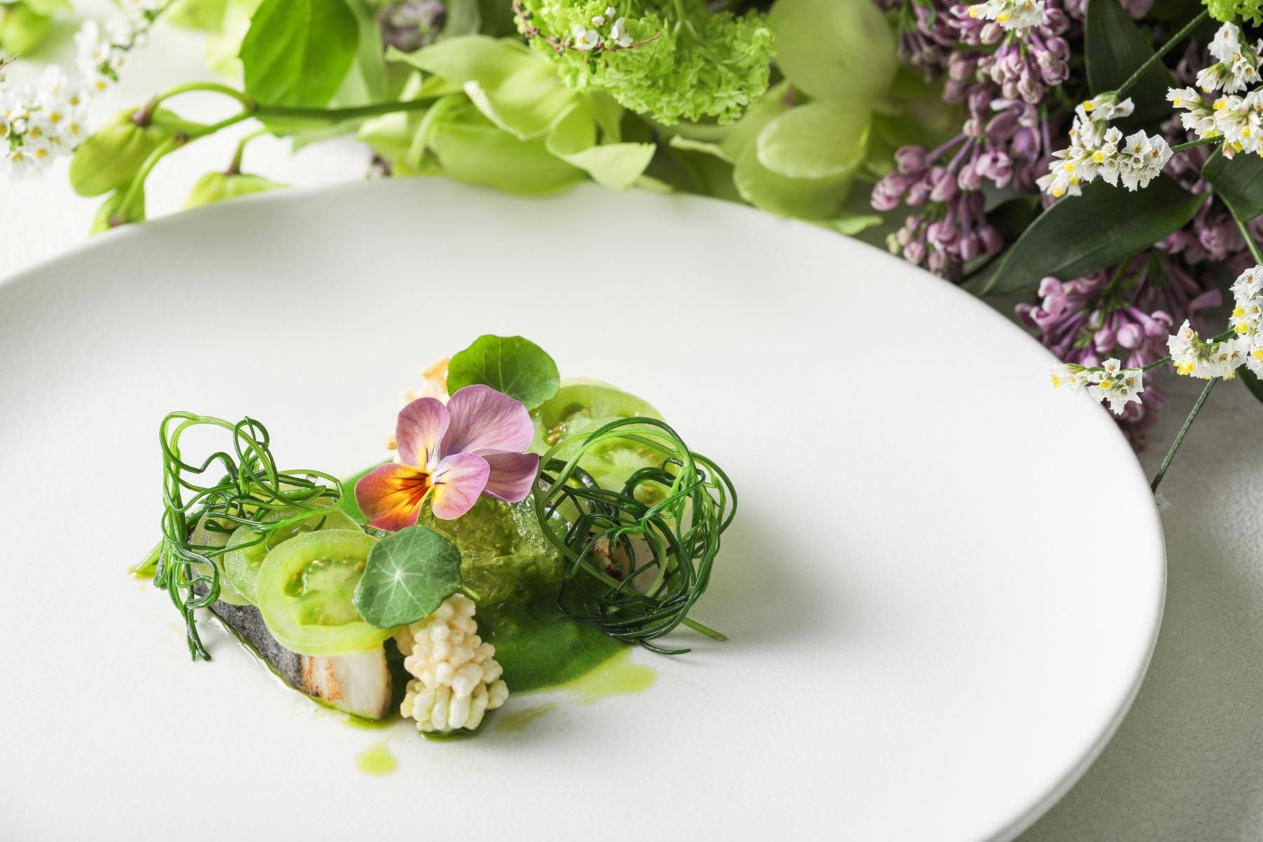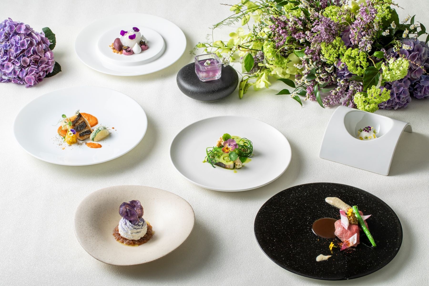 紫陽花カラーを中心に、色彩豊かな全7皿構成の本コースは、様々な食感と風味、香りをお楽しみいただけます。