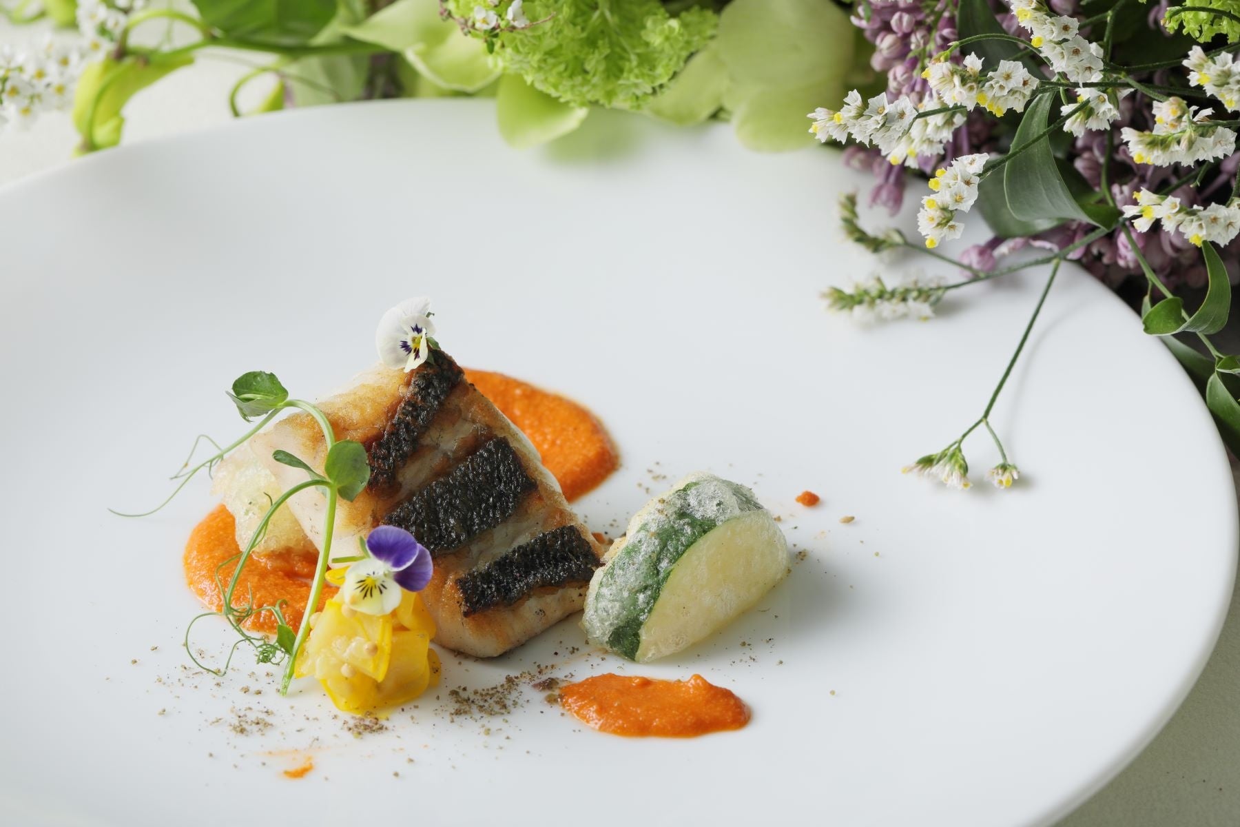 【魚料理】鱸のポワレとズッキーニのベニエ ロメスコソース ザータースパイスと共に