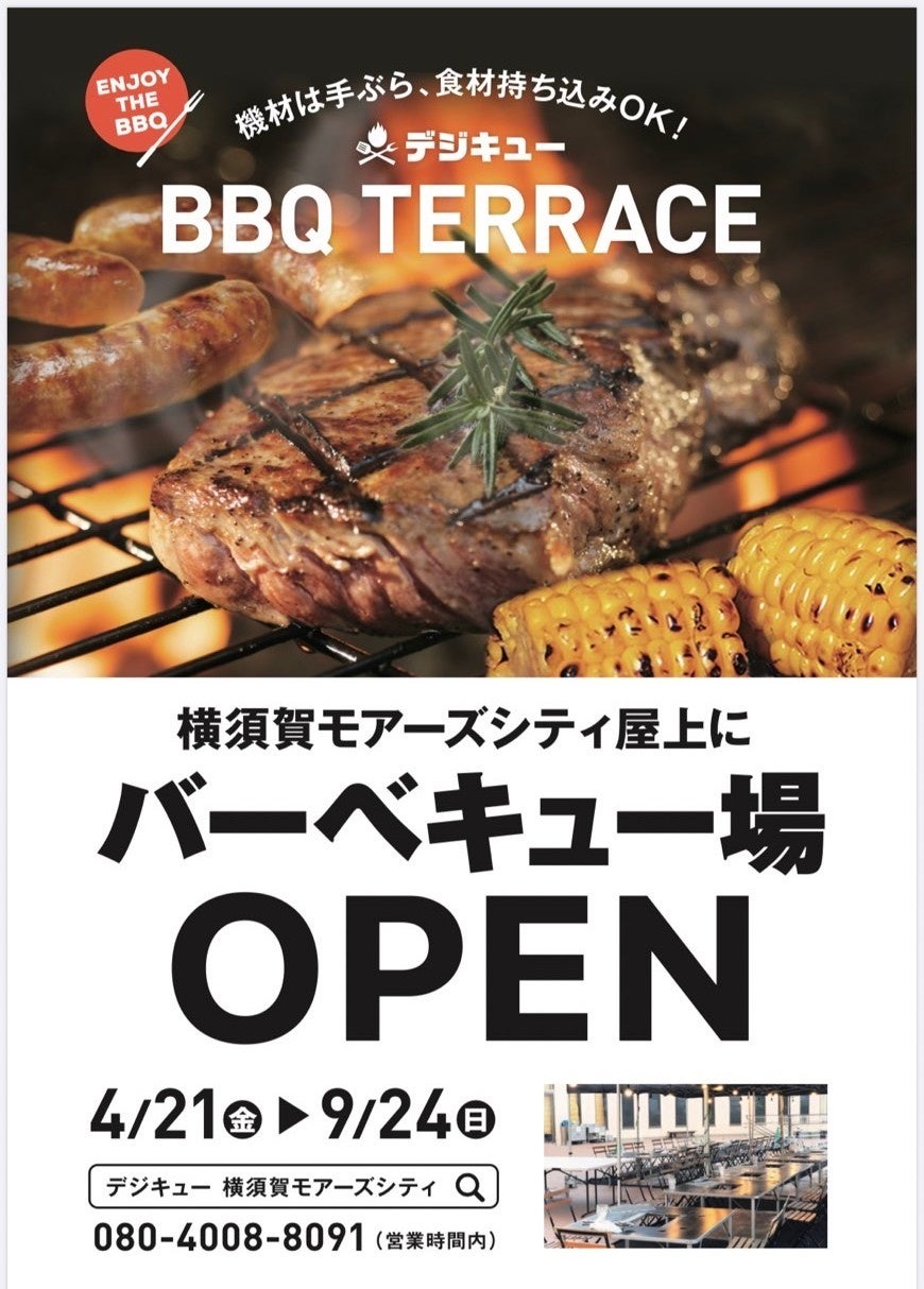 横須賀中央駅前の横須賀モアーズシティ(神奈川県横須賀市)にてバーベキュー場「デジキューBBQテラス横須賀モアーズシティ店(TEL 080-4008-8091 )」をオープン。期間は4月21日-9月24日。