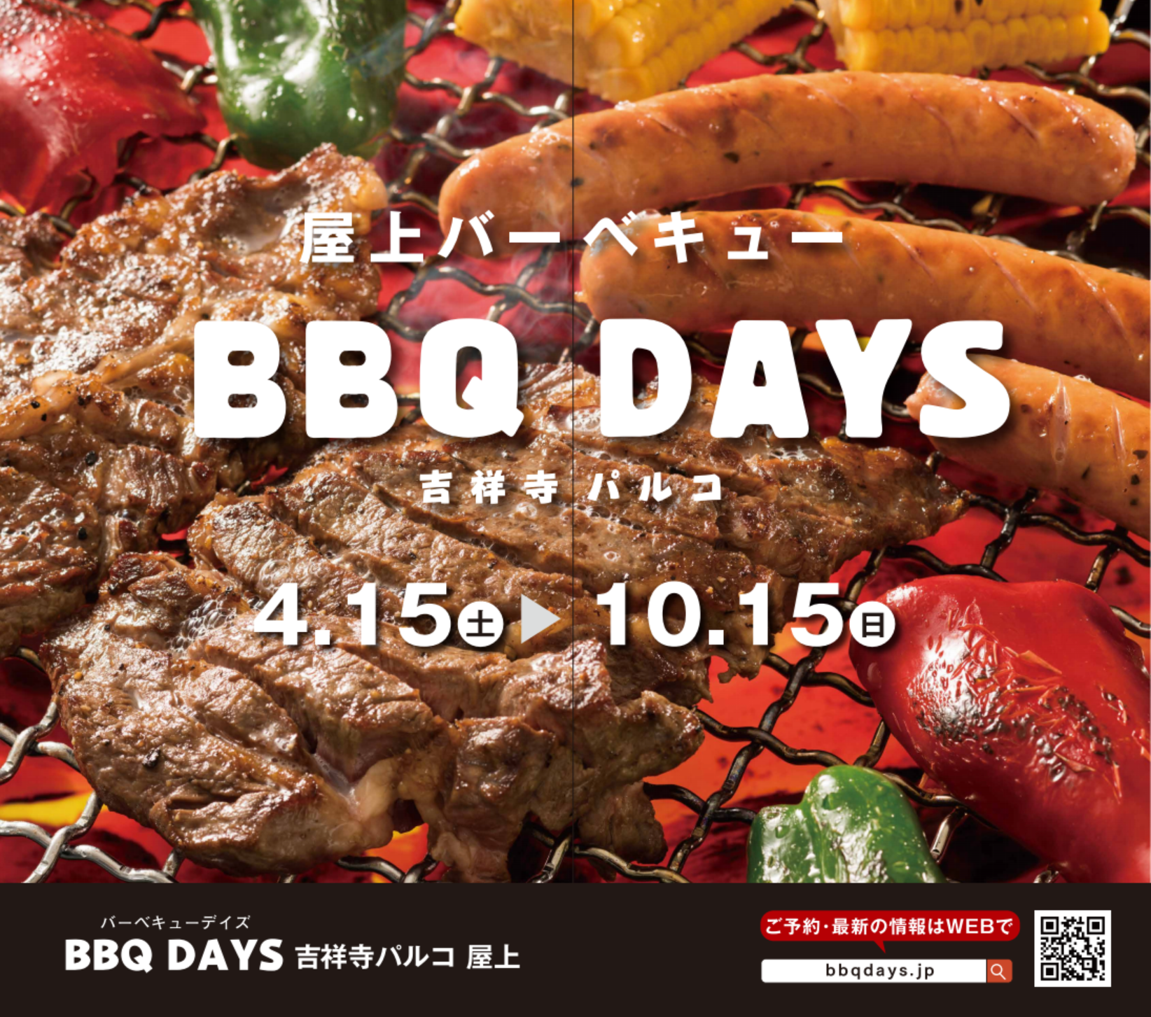 バーベキュー予約ならBBQDAYS!JR吉祥寺駅すぐ!PARCO吉祥寺店の屋上にてバーベキュー場「BBQDAYS吉祥寺パルコ店(TEL070-3968-1950)」がオープン。期間は4月15日-10月15日。