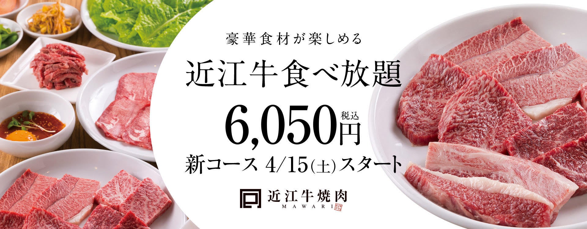 マワリ株式会社(本社:滋賀県草津市 代表取締役:田口博一)が運営する「近江牛焼肉 MAWARI 」では、近江牛を中心とした豪華な食材をお楽しみいただける焼肉食べ放題を、2023年4月15日(土)より6,050円(税込)の新コースとしてご提供いたします。