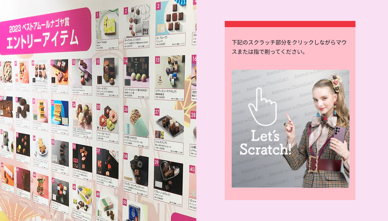 デジタルスクラッチキャンペーンツール「FARO SCRATCH(ファーロ スクラッチ) https://lp.faro-scratch.com/ 以下、FARO スクラッチ サービス提供:株式会社ADDIX)」は、ジェイアール名古屋タカシマヤ「2023 アムール・デュ・ショコラ」にて、来場者限定の参加型キャンペーン「2023ベストアムールナゴヤ賞」と「2023アムールアワード」に採用されました。「ベストアムールナゴヤ賞」への活用は、昨年に続き2年連続となります。