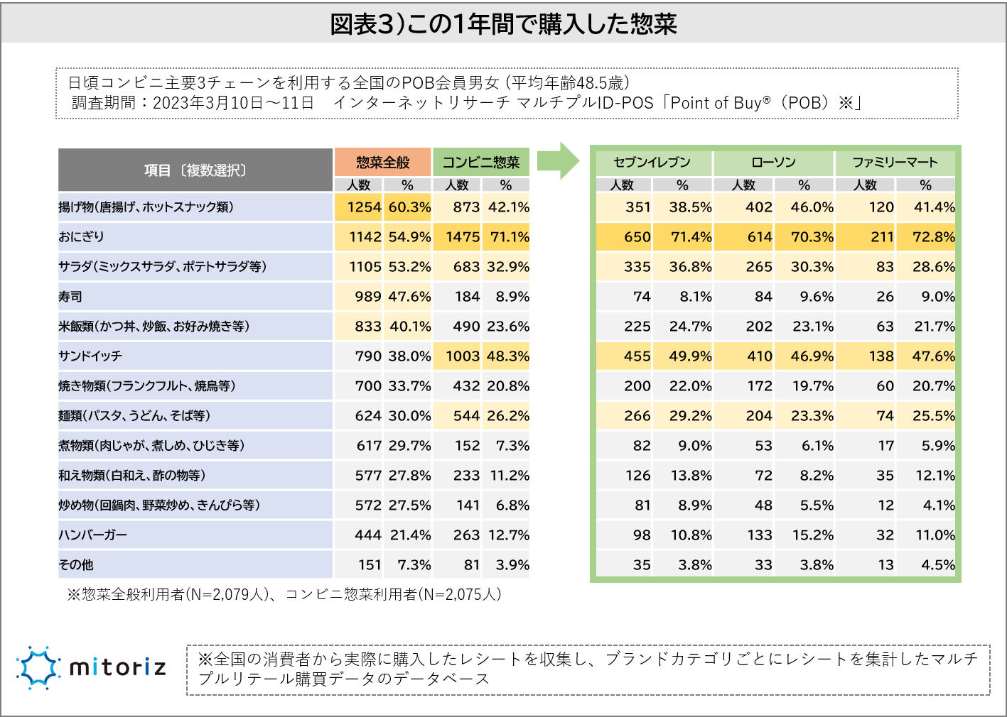 続いてこの1年で良く購入した惣菜に関して比較したところ、惣菜全般は「揚げ物(60.3%)」、「おにぎり(54.9%)」、「サラダ(53.2%)」という結果となりました。一方でコンビニ惣菜は「おにぎり(71.1%)」、「サンドイッチ(48.3%)」が続き、次に「揚げ物(42.1%)」となり、主要3チェーンでいずれも同様の傾向でした(図表3)。