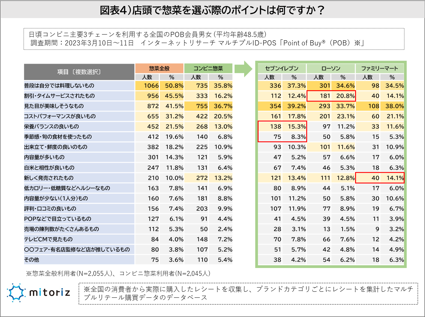 また、チェーンごとで比較するとセブンイレブンは「栄養バランスが良いもの(15.3%)」、ローソンは「割引・タイムサービスされたもの(20.8%)」、ファミリーマートは「新しく発売されたもの(14.1%)」が、それぞれ他2チェーンよりも重視されている傾向があります(図表4)。