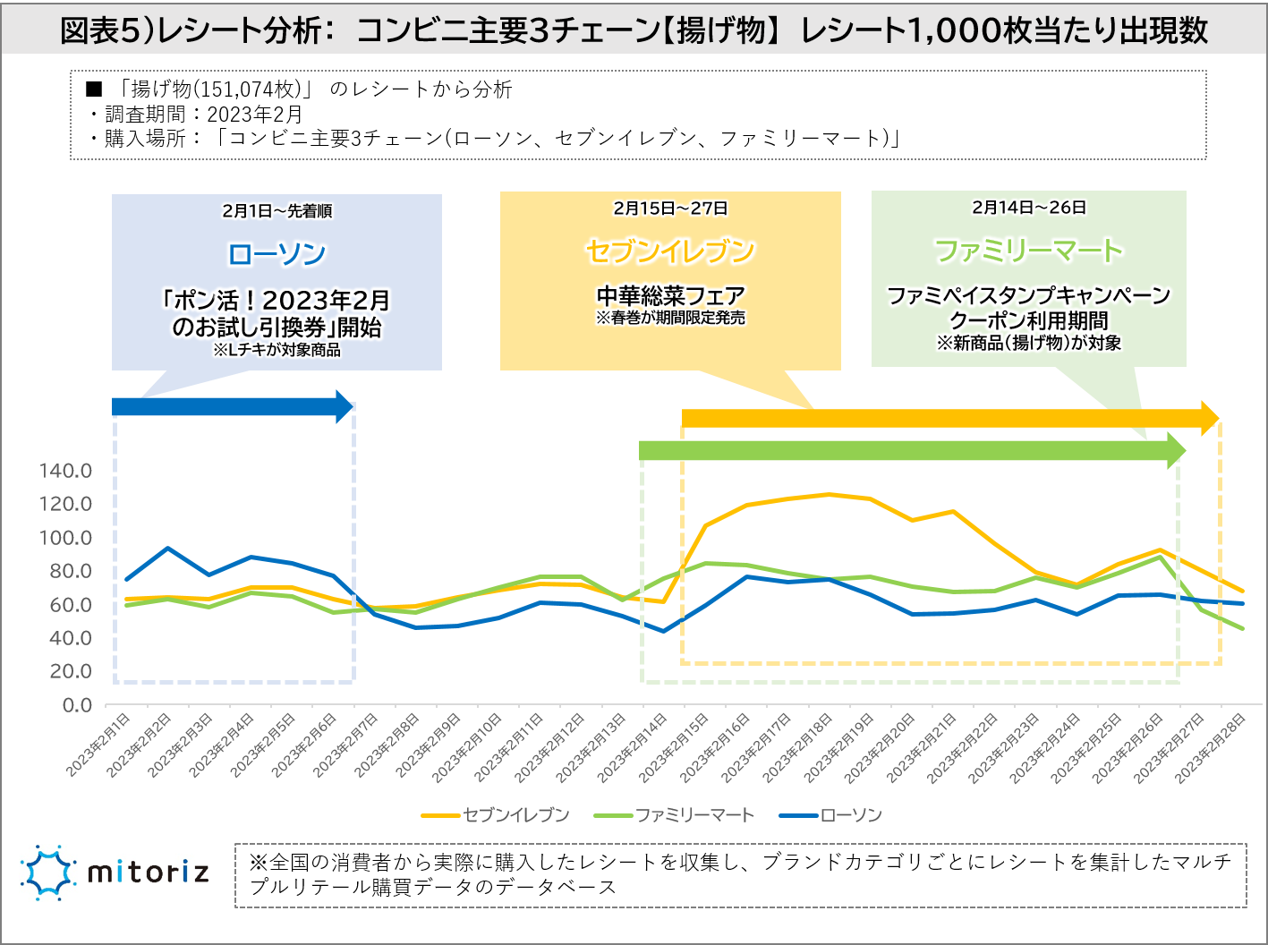 - 【レシート分析】コンビニ主要3チェーンの「揚げ物」の出現率推移。フェア実施で傾向顕著