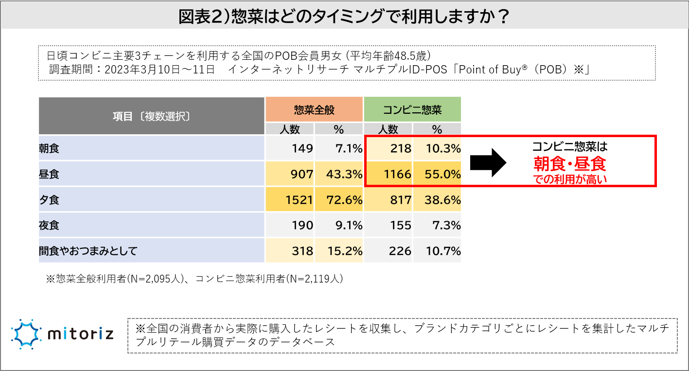 - 惣菜全般は夕食での利用が多いが、コンビニ総菜は朝食と昼食での利用率が高い
