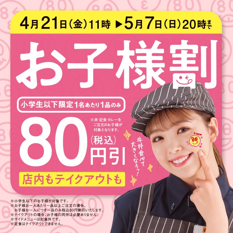 - 【GW期間中、ファミリー層の利用促進】お子様の食事を税込80円引きする「お子様割」を吉野家全国店舗で4月21日(金)11時より開始