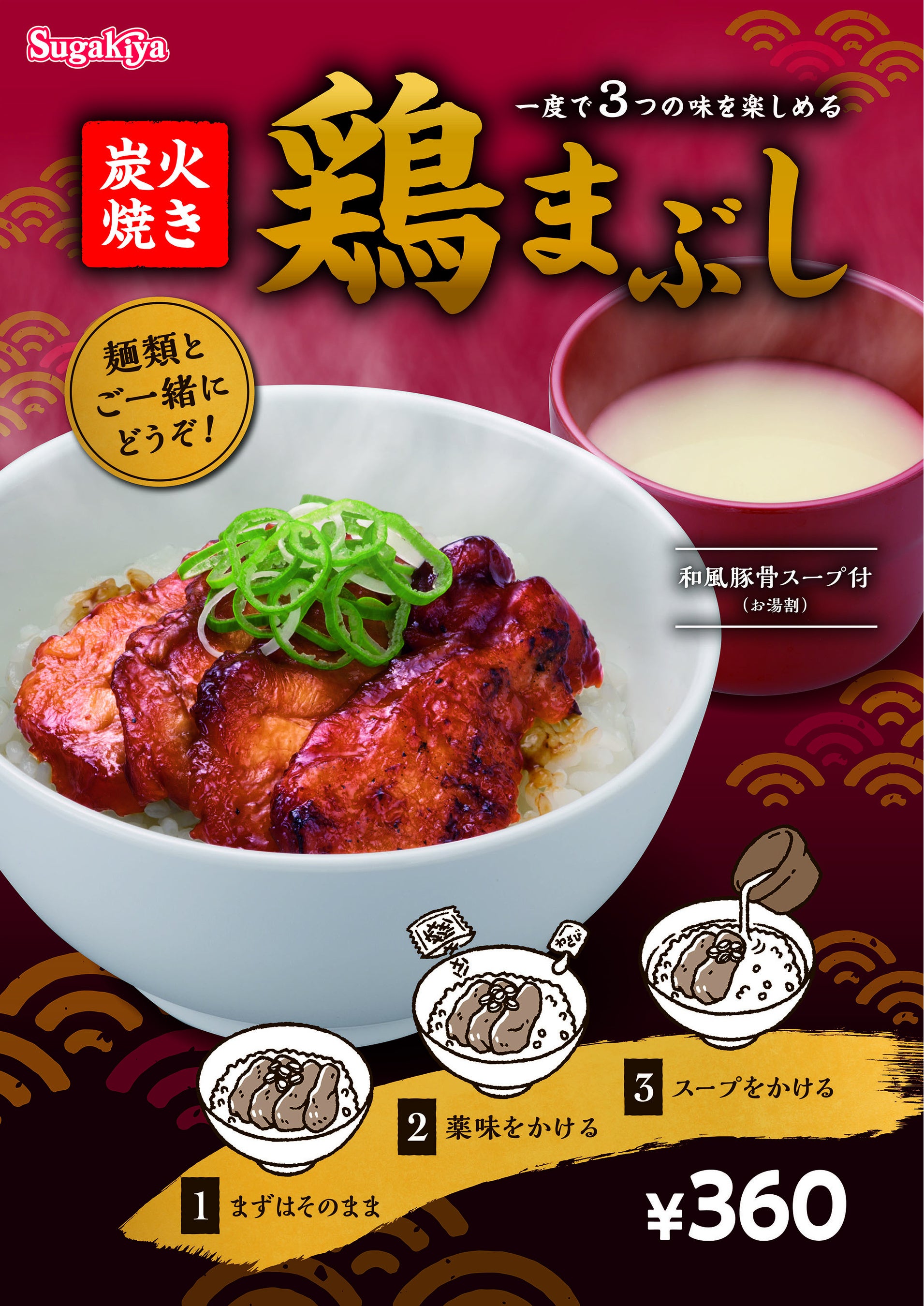 スガキヤ特製スープで食べる、新提案のごはんメニューです。ソフトな鶏もも肉を炭火で焼き上げ、かば焼き風のタレで味付けしました。