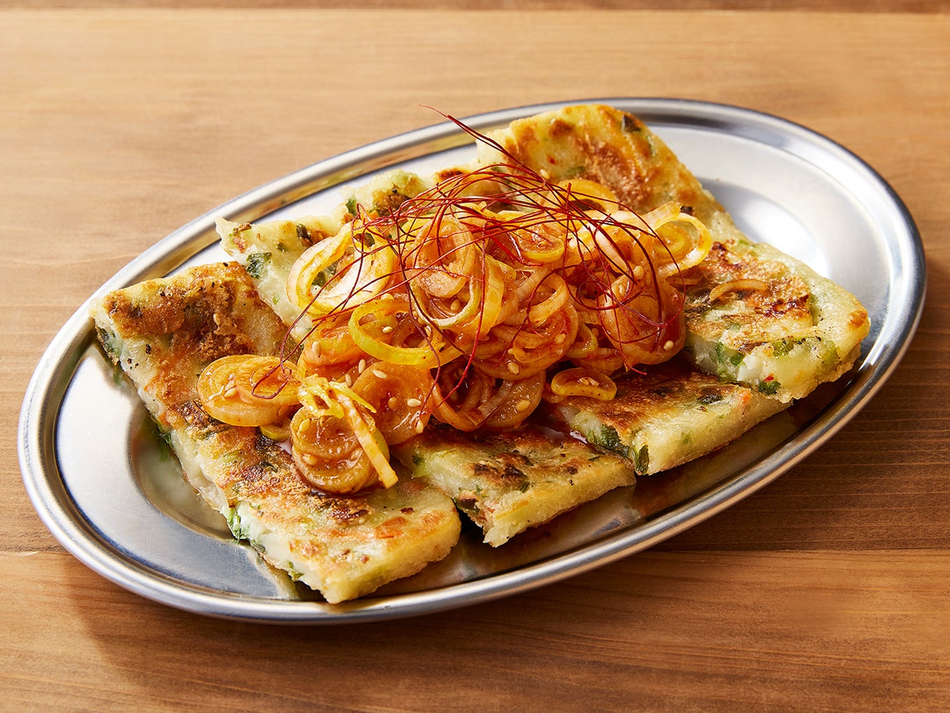 イカと3種の野菜(ねぎ、玉ねぎ、にんじん)の入ったチヂミを香ばしく揚げました。コチュジャン入りの甘辛いたれと長ねぎを合わせた、特製ねぎだれと一緒にお召し上がりください。