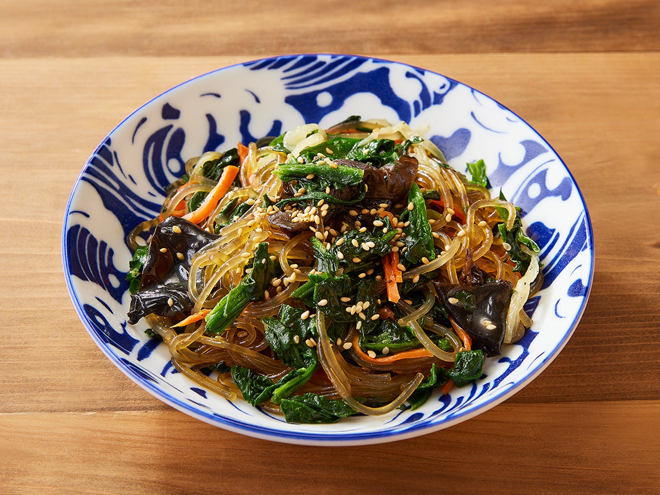 韓国産のもちもちのチャプチェにニラ、ニンジン、キクラゲ、ほうれん草を合わせました。胡椒を効かせ、お酒に合う“サカバのチャプチェ”に仕上げています。