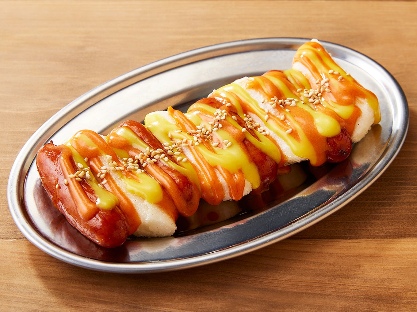 SNSで今話題の、お餅とソーセージが串に刺さった韓国屋台の人気メニューをキッサカバ流にアレンジ。甘辛いロゼソース(コチュジャン+クリーム)とハニーマスタードソースがくせになります。