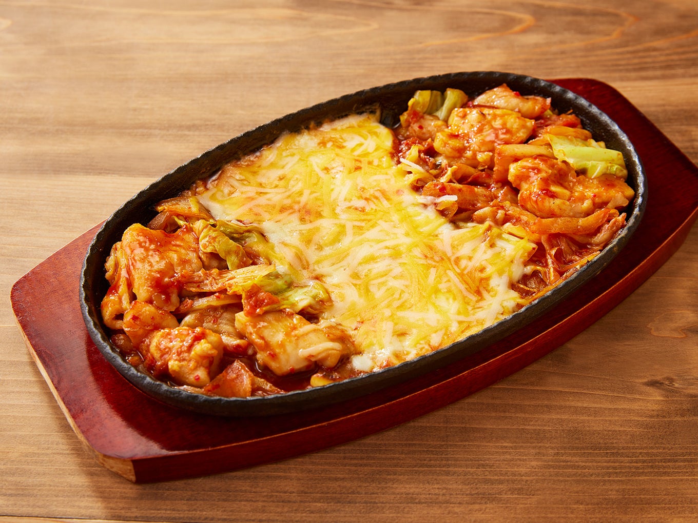やわらかなタッカルビ(鶏肉)と野菜に甘辛いコチュジャンベースのたれが絡みます。とろけるチーズをた~っぷり絡めてお召し上がりください。