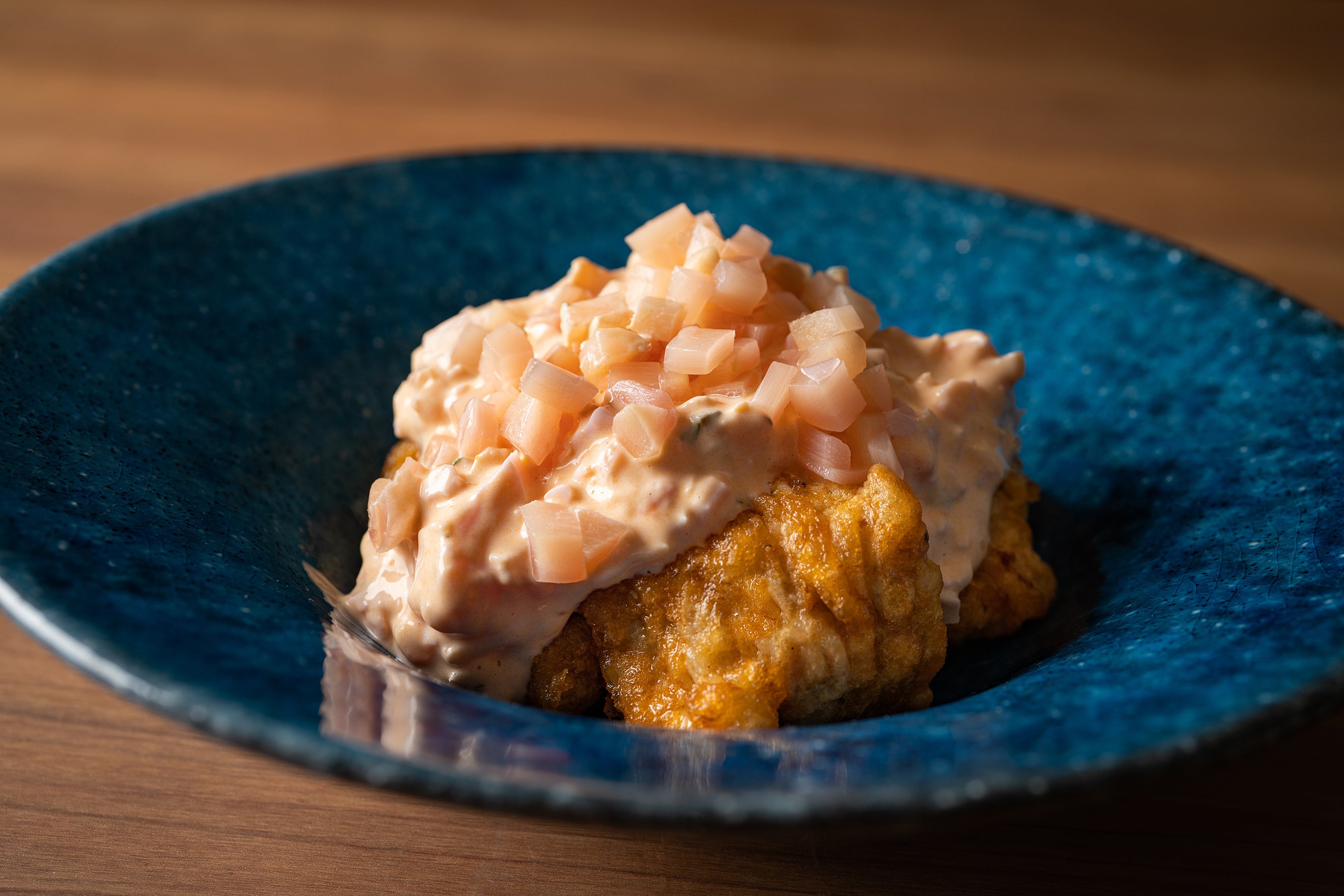 こだわりがつまった卵「塚だま®」をふんだんに使ったリッチなタルタルソースに、やさしい辛さ・爽やかな香り・シャキシャキッと歯切れ良くさっぱりとした味わいが魅力の「岩下の新生姜」をたっぷり合わせました。今年1月のリニューアルで、若鶏を宮崎・鹿児島産に変更し、タルタルソースは35%増しでのせています。
