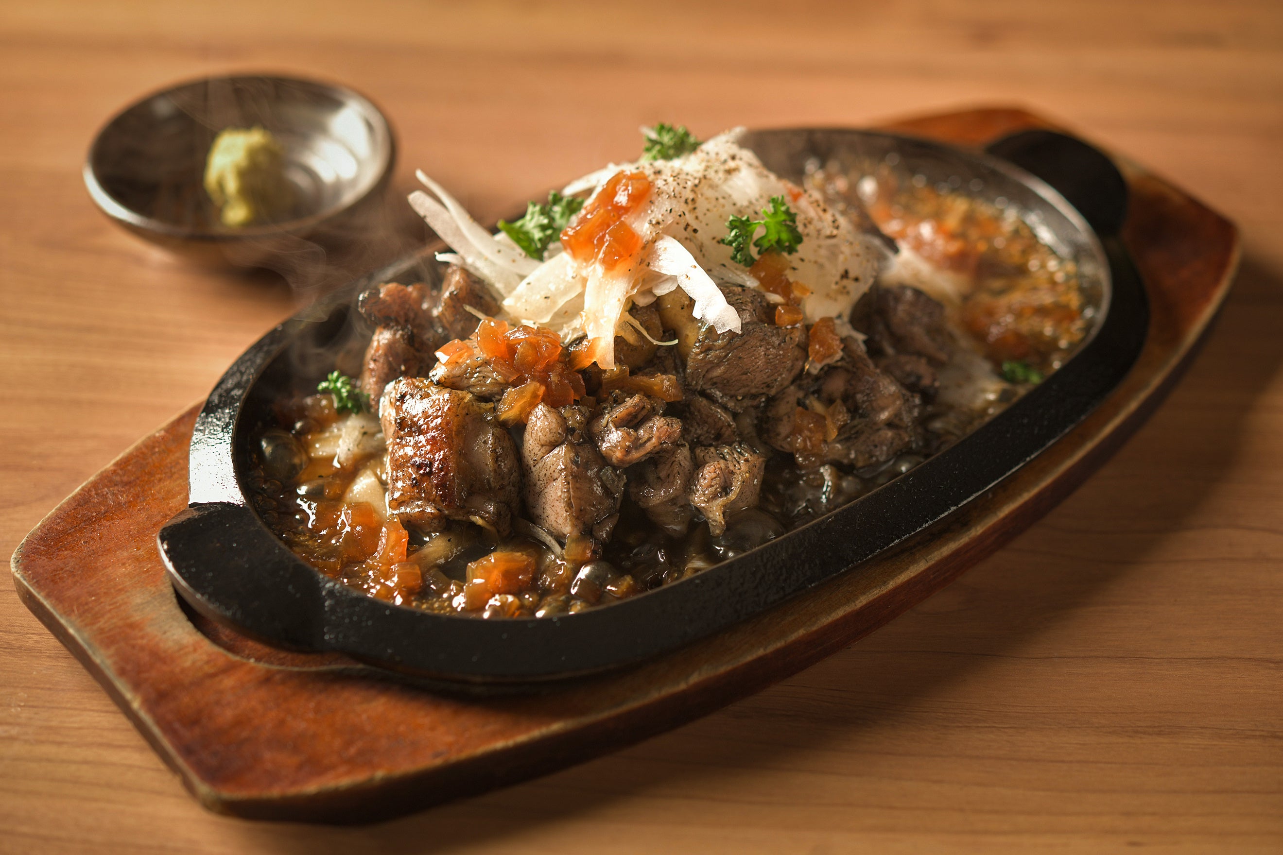 炭火で丁寧に焼き上げた炭の芳しい香りをまとった地鶏のもも肉・むね肉の上に、柔らかでシャキシャキの新玉葱のスライスをたっぷりとのせています。玉葱をたっぷりと使ったシャリアピンソースを熱々の鉄板に回しかけます。