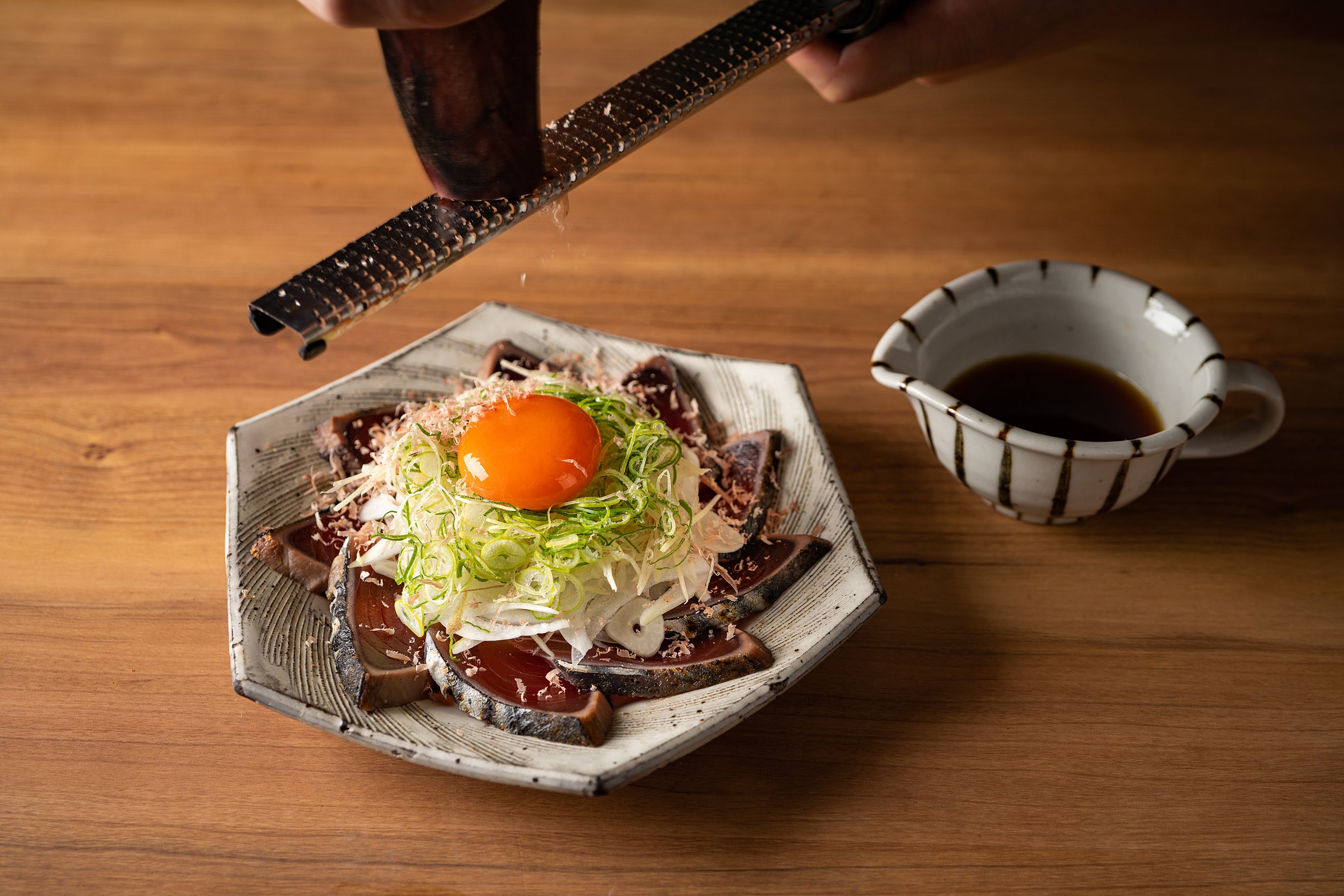 釣りあげた直後に船上で急速冷凍を施した新鮮な鰹をたたきにし、爽やかな甘みとシャキシャキ食感の新玉葱をたっぷりとのせています。さらに、スタッフが卓上で枕崎産の“新さつま節”を削りかける、香り高い一品です。