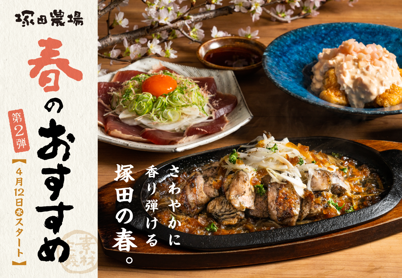 春のごく限られた期間だけ楽しめる、新玉葱の柔らかな味わいを楽しめる地鶏炭火焼や、こだわりがつまった卵「塚だま®」をふんだんに使ったリッチなタルタルソースに、やさしい辛さ・爽やかな香り・シャキシャキッと歯切れ良くさっぱりとした味わいが魅力の「岩下の新生姜」をたっぷり合わせた「国産若鶏のチキン南蛮」など、“塚田農場の春”をお楽しみください。