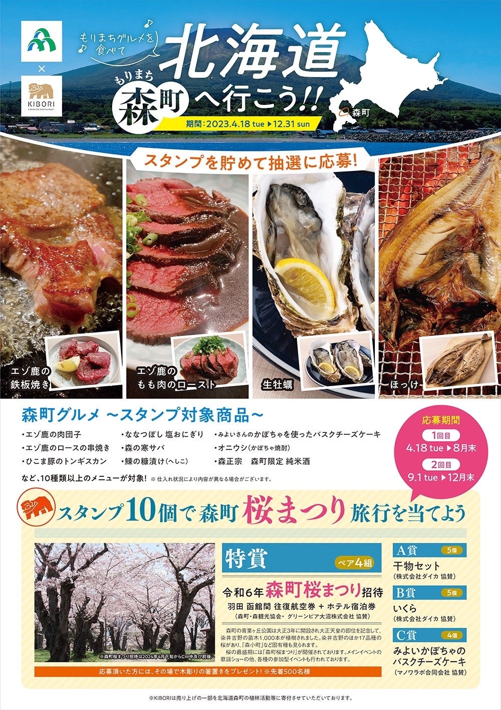 『KIBORI』のコンセプトのプレ北海道体験をリアル北海道体験につなげる企画として、「森町桜まつり2024」に行こう!スタンプラリーキャンペーンも同時開催します。森町の食材を使用した対象メニューをご注文毎にもらえるスタンプ10個を集めて応募すると、抽選で4組8名様へ「森町桜まつり2024」への招待券や森町の特産品を計18名様にプレゼントします。また、応募いただいた先着500名様に、木彫りの熊の箸置きをプレゼントいたします。