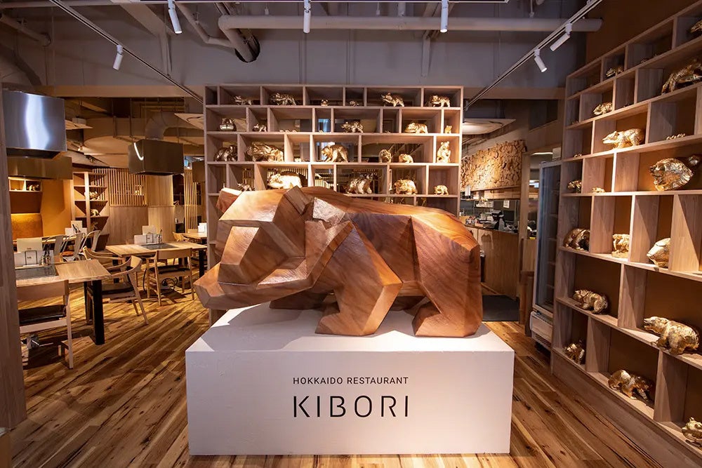 『KIBORI』は “東京で一番愛される北海道レストラン”を目指しました。北海道のイメージを持つ木彫りの熊をブランドモチーフとし、肉、チーズ、野菜、海鮮と北海道の魅力、美味しさ、遊び心があふれるレストランです。店内は「DAICHI」 と「UMI」 の2フロア構成で、日本中から集まった大小合わせて1,000頭の木彫りの熊が並びます。北海道の食の魅力と新しい体験を提供する「KIBORI」は、ここでしか味わえないプレ北海道体験をお楽しみいただけます。