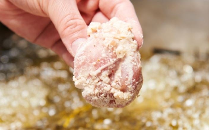 ◆打ち粉・バッター・まぶしの3段製法の保水効果により、肉の繊維を壊さず肉汁を逃さないほか、サクサク感の持続する衣に改良しています。