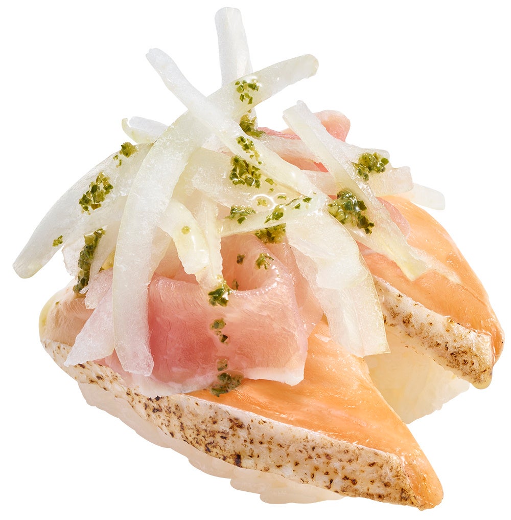 また、名峰大山から湧き出る栄養たっぷりの水で稚魚まで育った、ほどよい脂のりが特長の鳥取県境港産「国産生サーモン」も登場します。一度も冷凍されずに店舗に届くため、生ならではのもっちりとした食感を味わえるだけでなく、特製の醤油ダレの漬けやレモンペッパー、ユッケ、おろしいくら、ねぎとろ包みといろいろな楽しみ方をご堪能いただけます。さらに、フレッシュアボカドや自家製タルタル、生ハムなどと合わせた変わり種や、販売するたびに大人気の期間限定シリーズ「マーラー風味」のサーモンバージョン、おはぎ仕立ての進化系創作すしの「サーモンのおはぎ」など、サーモン商品を多数取り揃えております。