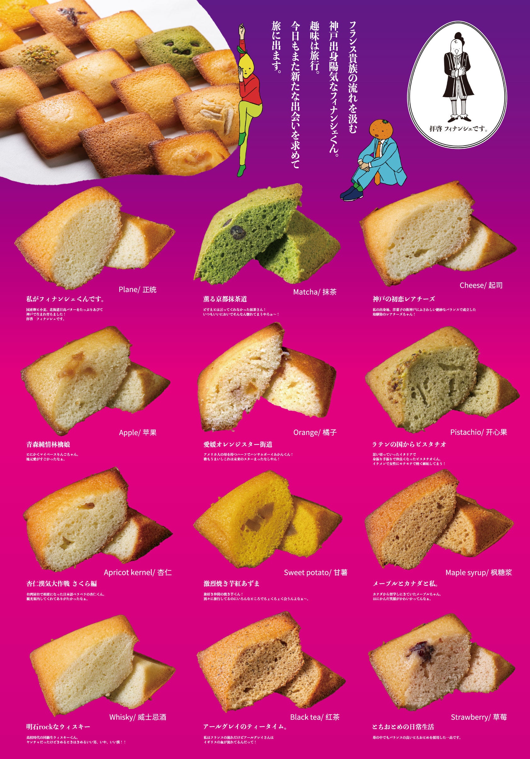 『フランス貴族の流れを組む神戸出身フィナンシェくんが、旅先での出会いを元に新しい味を生み出していく。』というストーリー仕立ての新商品開発も話題の一つ。