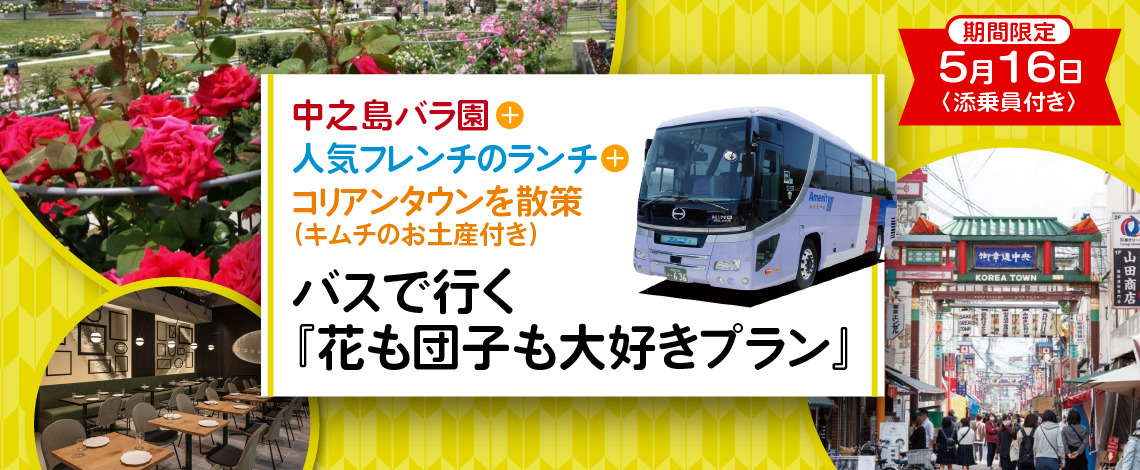 株式会社フォーティーズ(本社:大阪市鶴見区、代表取締役 岡武史)は【5月16日(月)限定大阪出発】《全国旅行支援》〈添乗員付き〉中之島バラ園+人気フレンチのランチ+コリアンタウンを散策(キムチのお土産付き) バスで行く『花も団子も大好きプラン』日帰りバスツアーのオンライン販売を開始しました。