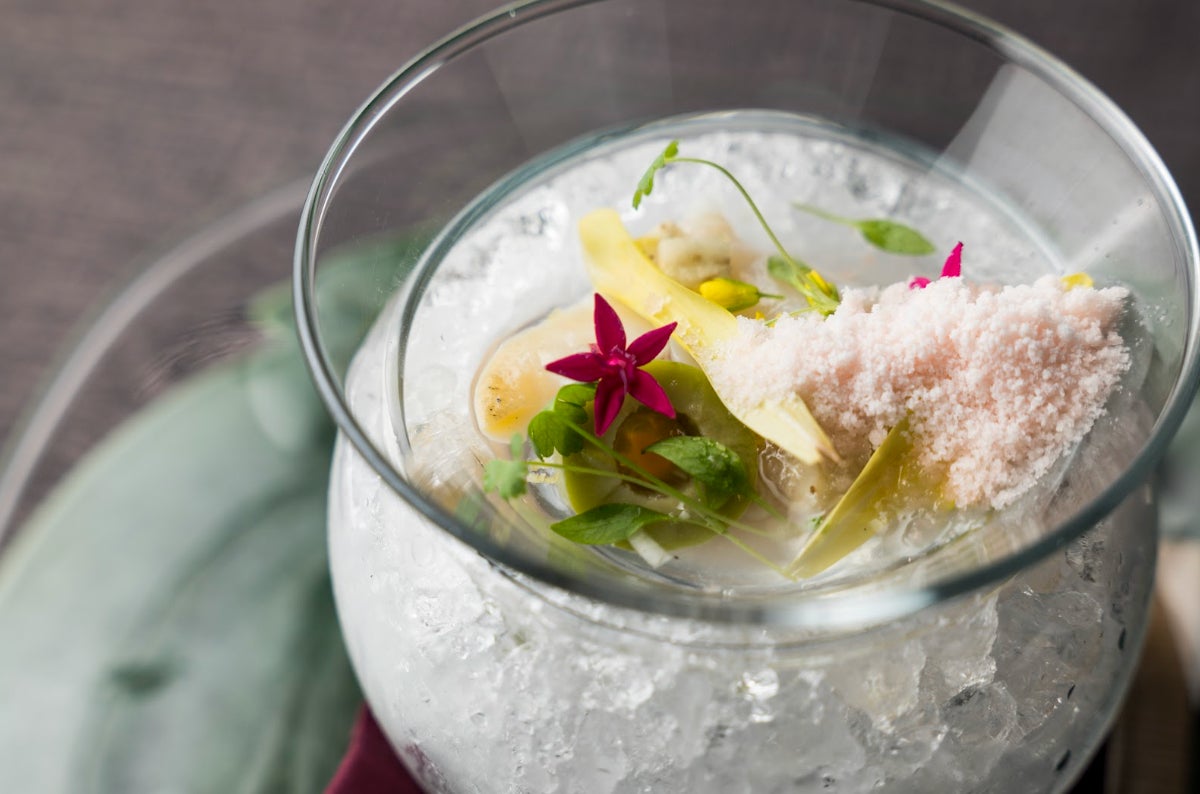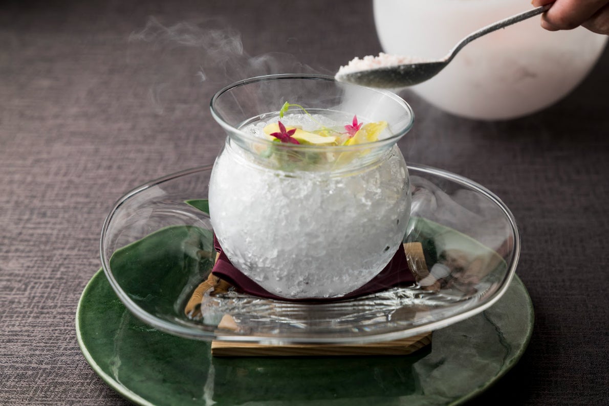 筍と鶏肉、こしあぶらをトリュフでまとめ、装飾用の菜の花、ふきのとうと一緒に春の霞を表現したスモークで閉じ込め、「春の息吹」を一皿上で表現しています。