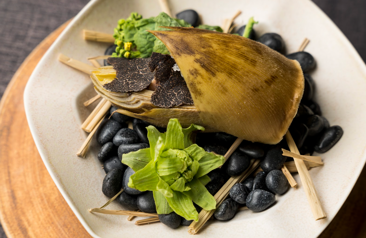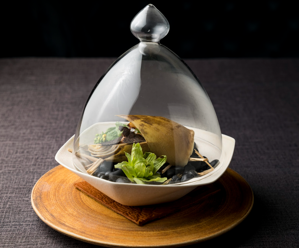筍と鶏肉、こしあぶらをトリュフでまとめ、装飾用の菜の花、ふきのとうと一緒に春の霞を表現したスモークで閉じ込め、「春の息吹」を一皿上で表現しています。