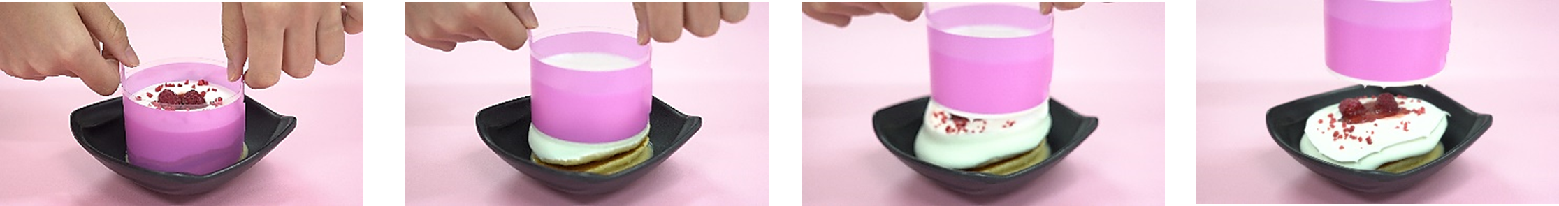 ふんわりとしたパンケーキを覆う優しい甘さの練乳ホイップクリームのミルキー感やクランチラズベリーのカリッとした食感、いちごソースの甘酸っぱさなどが楽しめます。また、フォークを入れると中に忍ばせているバナナピューレが登場し、その風味が広がります。お食事後のデザートとしてもおやつとしてもぴったりな、見て楽しい、食べても美味しい「フォトジェニックスイーツ」です。