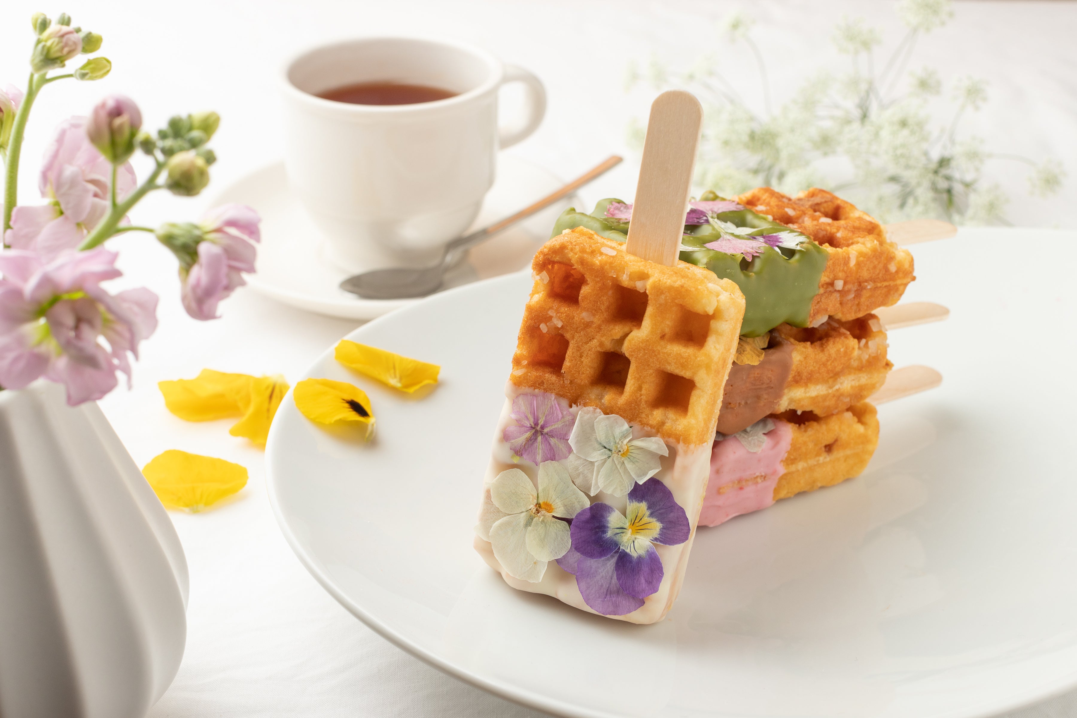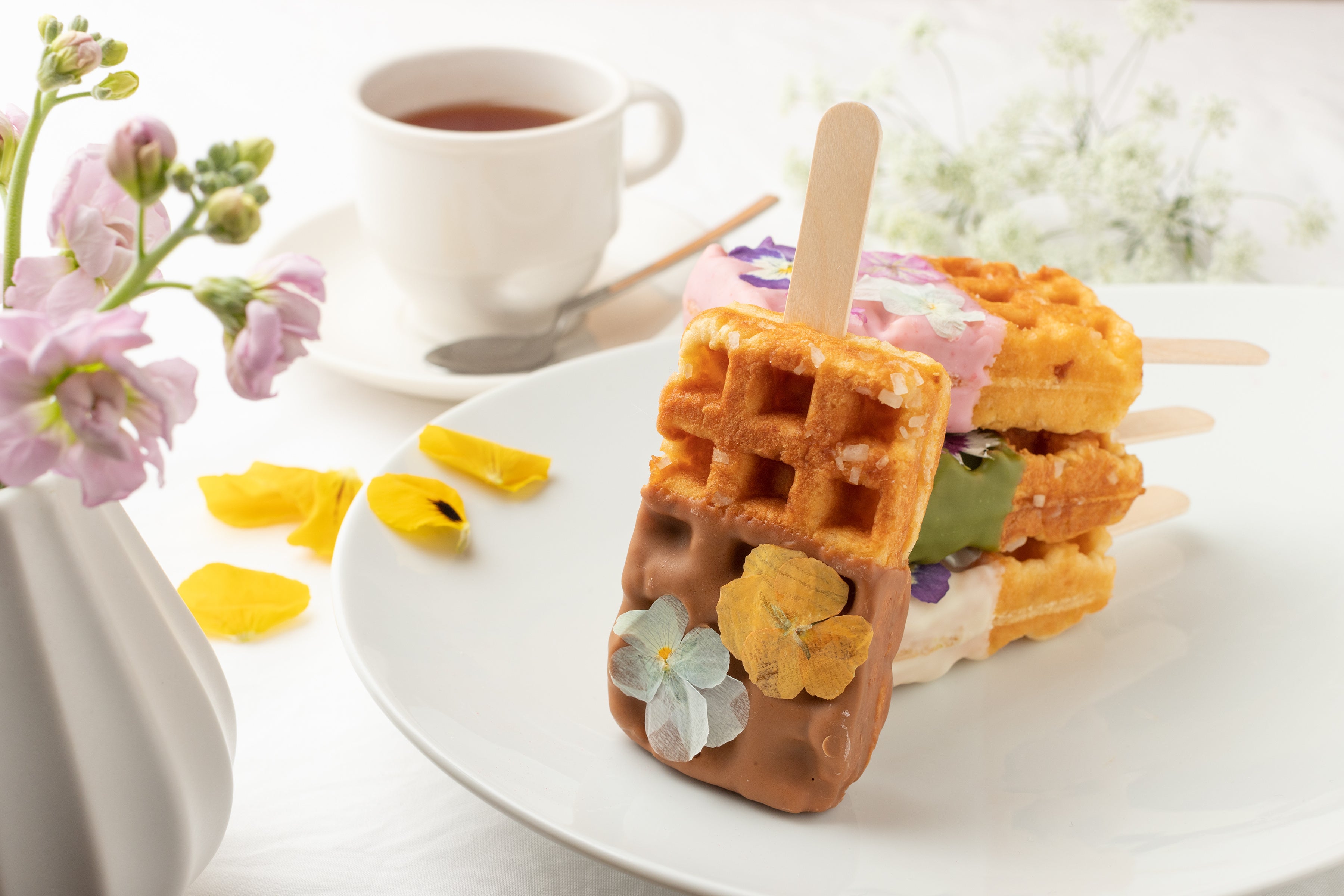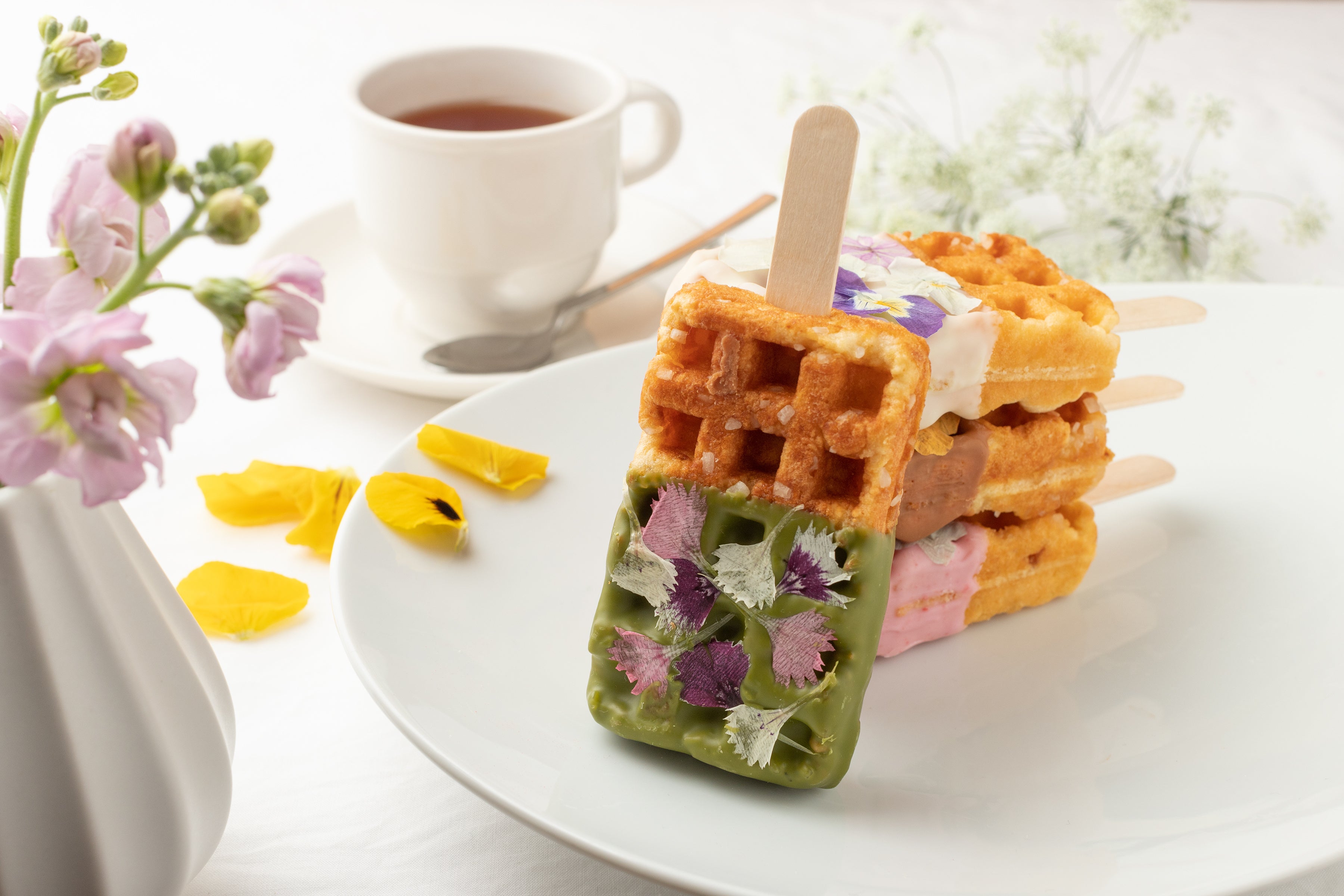 ワッフルにあしらわれたエディブルフラワーは、それぞれのチョコレートの色味に最もマッチした色と形のものを厳選。1枚1枚手作業で、バランスを見ながら丁寧にトッピングし、華やかで上品なビジュアルに仕上げております。