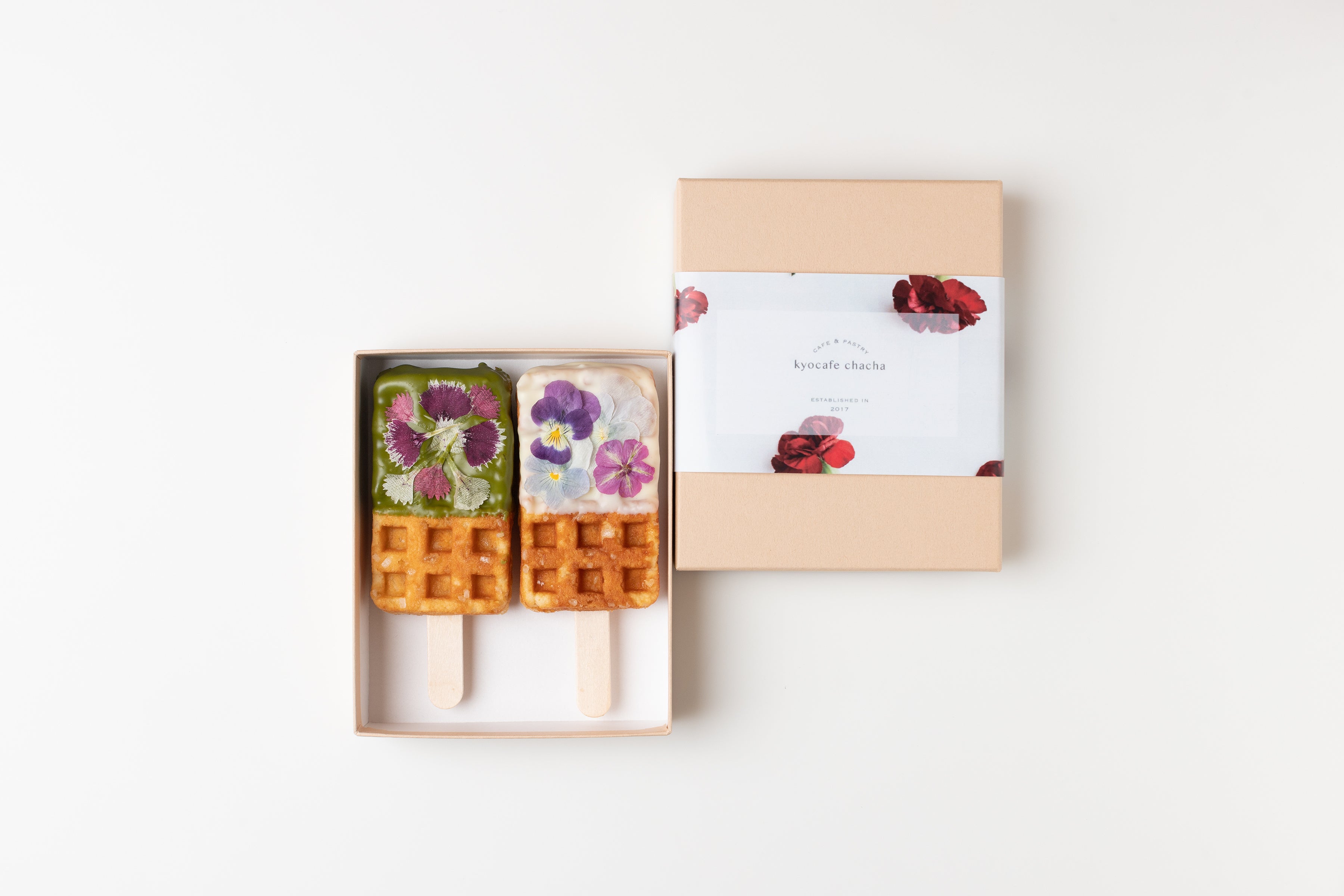 濃厚なホワイトチョコに白・ピンク・紫のビオラをトッピング。クリーミーなホワイトチョコと京ワッフルの相性は抜群。甘党にはたまらない1本。花びらが映えるフレーバー。
