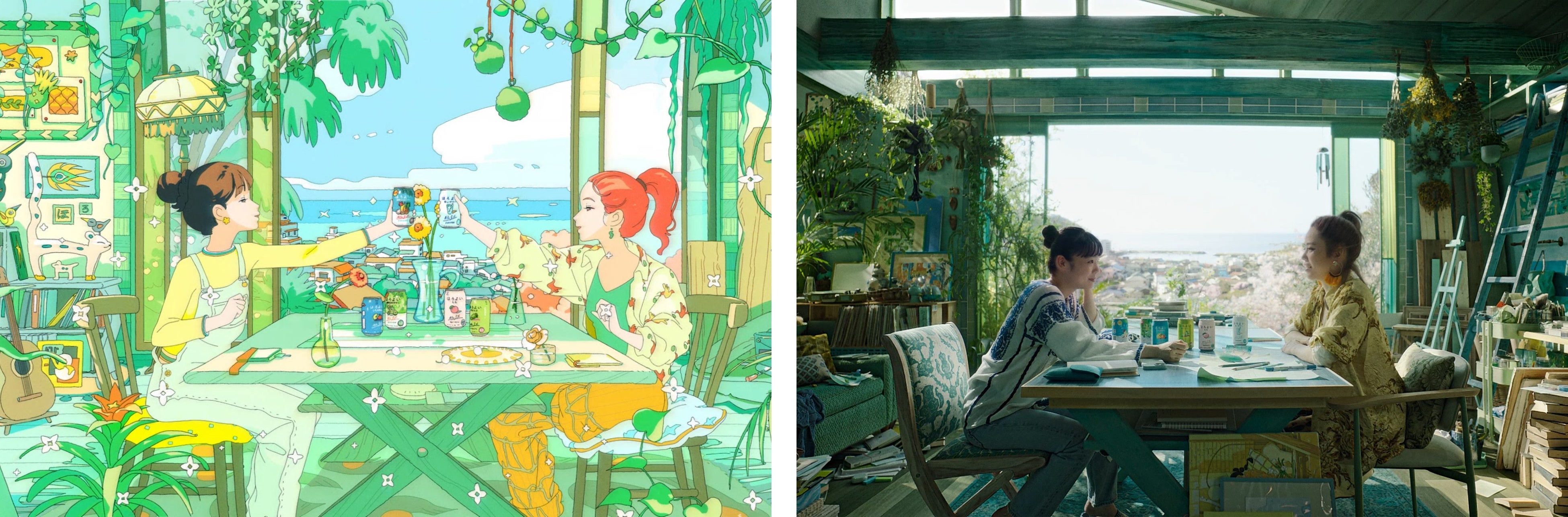 実写ver.では、娘役の古川さんは出版社勤務、母親役のCharaさんはイラストレーターとして登場。「ほろよい」を飲みながらお喋りを楽しむ、友達のような親子のかけがえのない時間を、表情豊かに演じます。また、部屋の壁には、これまでの「ほろよい」CMで散りばめられていたイラストが飾られ、こだわりの空間で2人が過ごす時間をお届けします。