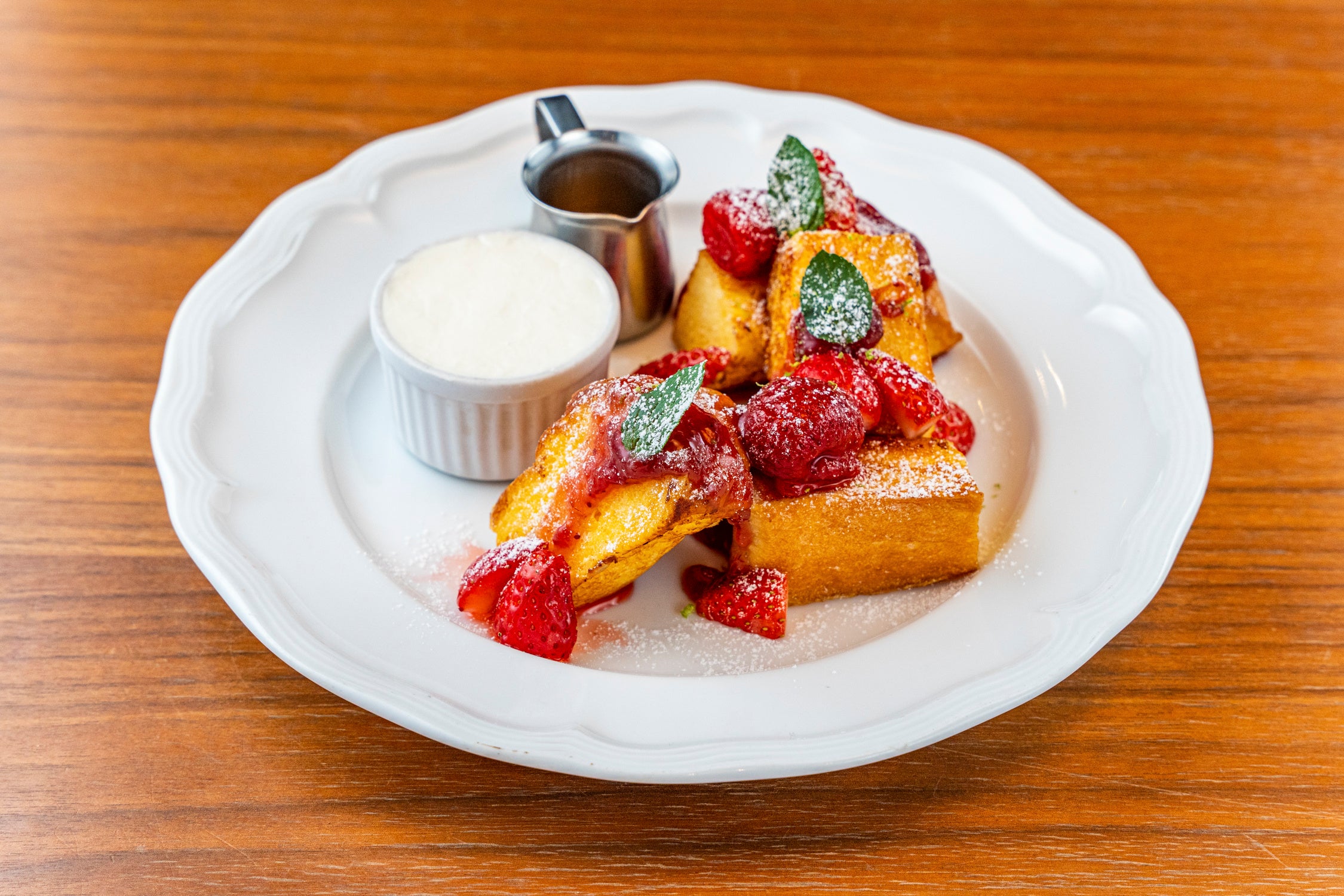 一晩じっくり漬け込んで味を染み込ませたフレンチトーストは、中はふわとろに焼き上げた絶妙なバランスに。メインのいちごはフレッシュ、コンポート、ジャムの3種類を贅沢につかいました。