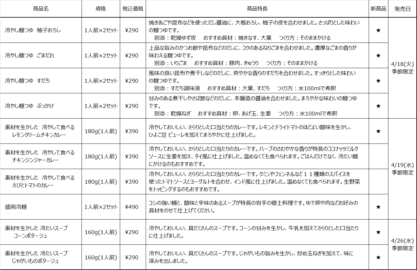 今回は、暑い季節の食欲がなくなる時や、食事の支度で極力火を使いたくない時にも便利な、季節限定の冷やしておいしい商品を順次発売します。