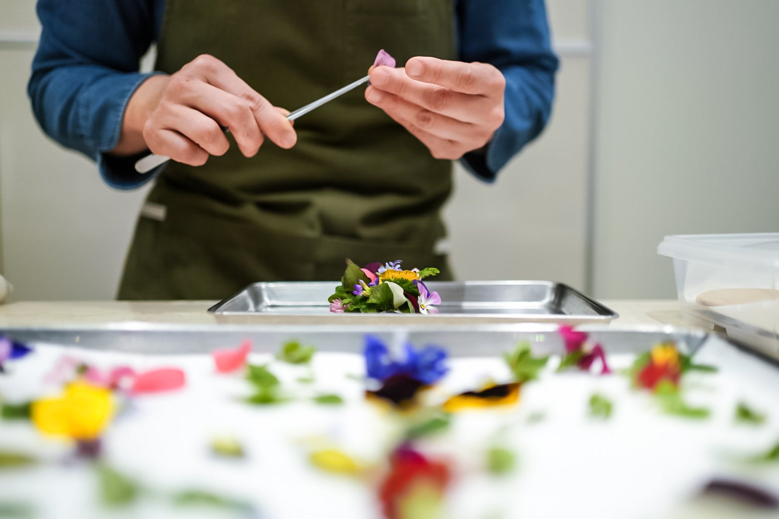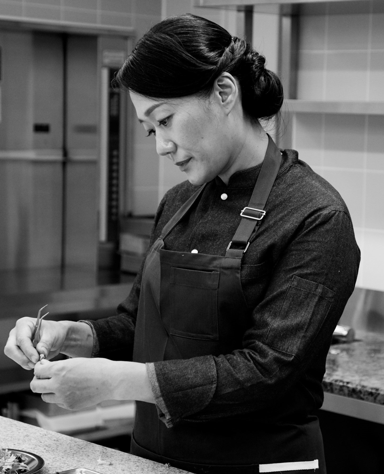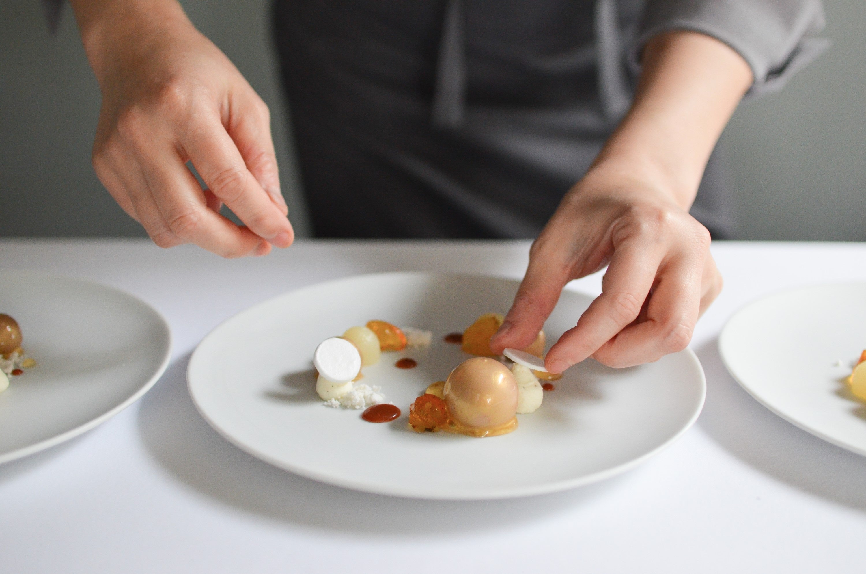 オトワレストランでは夫で料理長の音羽 元と共に厨房に立ち、栃木の食材の魅力を引き出すレストランデザートを手がけている。