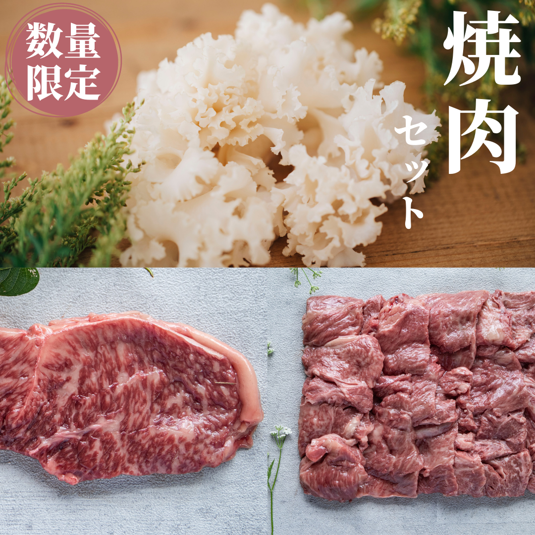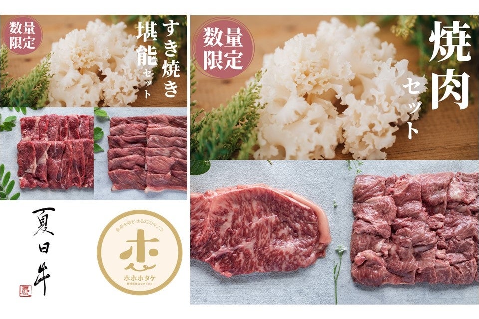 「夏日牛×ホホホタケ 焼肉セット」は「夏日牛」のサーロインステーキ、上カルビ、はなびらたけの白い花びらの部分「ホホホタケ」、軸の花托部分「ホホホの子」の組み合わせで7,400円(税込・送料別)、「夏日牛×ホホホタケ すき焼き堪能セット」は「夏日牛」の上スライスと牛スライス、「ホホホタケ」と「ホホホの子」で7,100円(税込・送料別)で、焼肉、すき焼き料理で「夏日牛」の肉汁とホホホタケの出汁・食感・旨味が混じりあい、両食材を美味しく楽しめる3~5人分のセットです。