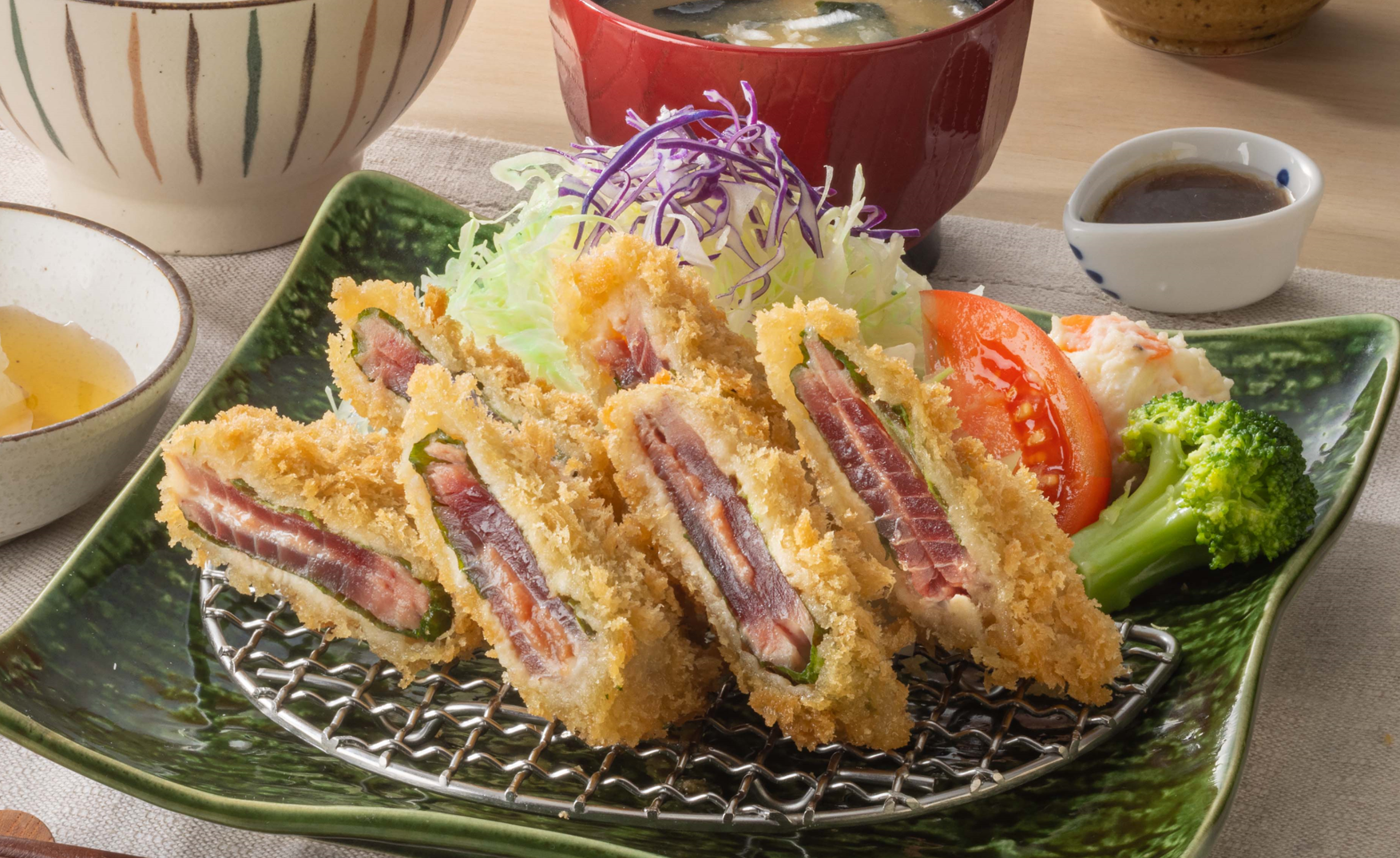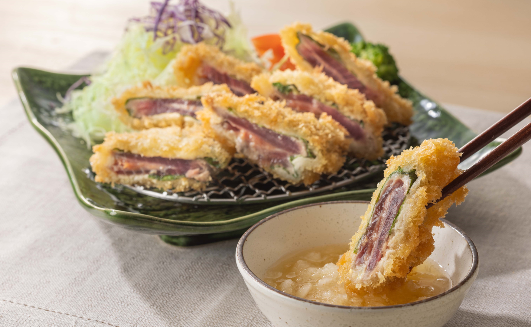 味のアクセントにしそと梅を加えた、風味豊かで「サックサク」な梅のはさみ揚げ。和風出汁のつゆと大根おろしでさっぱりとお召し上がりいただけます。この時期ならではの“鰹”の旨みを存分に味わえる贅沢な一品です。