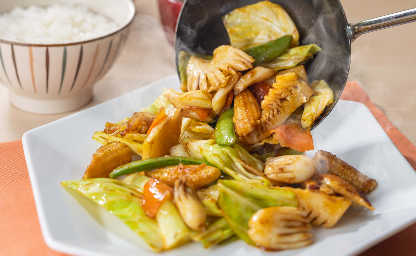 旨みを凝縮したXO醤入りの特製ダレで絡めた、ぷりぷりのイカとシャッキリ食感の春野菜は相性抜群。“こってり感”がありながら健康的においしく食べられる、XO醤独自のコクと旨みが決め手の、ご飯が進む一皿です。