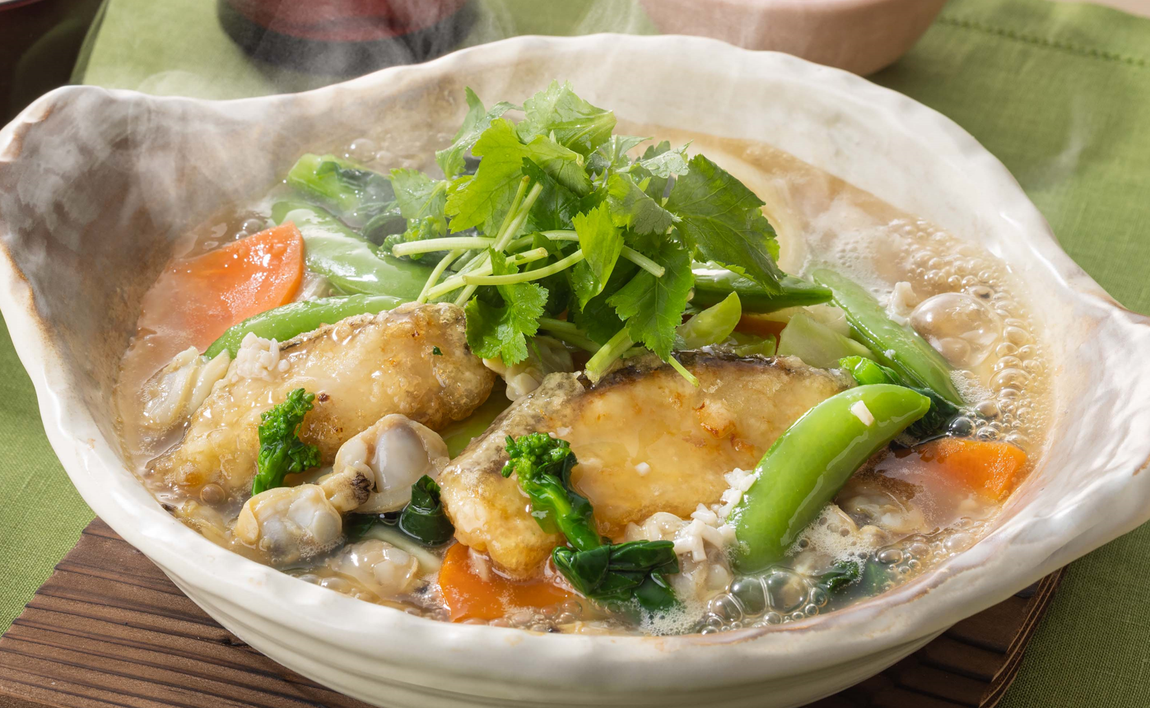 浅利と白身魚の土鍋あんかけご飯