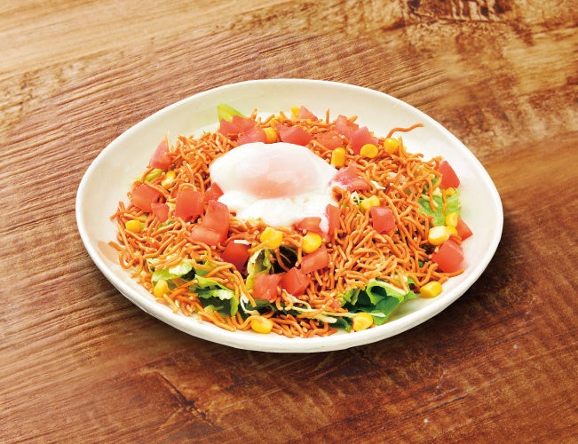 ベビースターのサラダとの相性抜群!シャキシャキレタスとトマト、コーンのサラダにベビースターをトッピングして温玉を合わせたら、 絶品おつまみ『パリポリ食感!つぼ八サラダ』の完成。ベビースターのパリポリ食感とチキンの旨みがヤミツキになる味わいで箸が止まらない美味しさです。